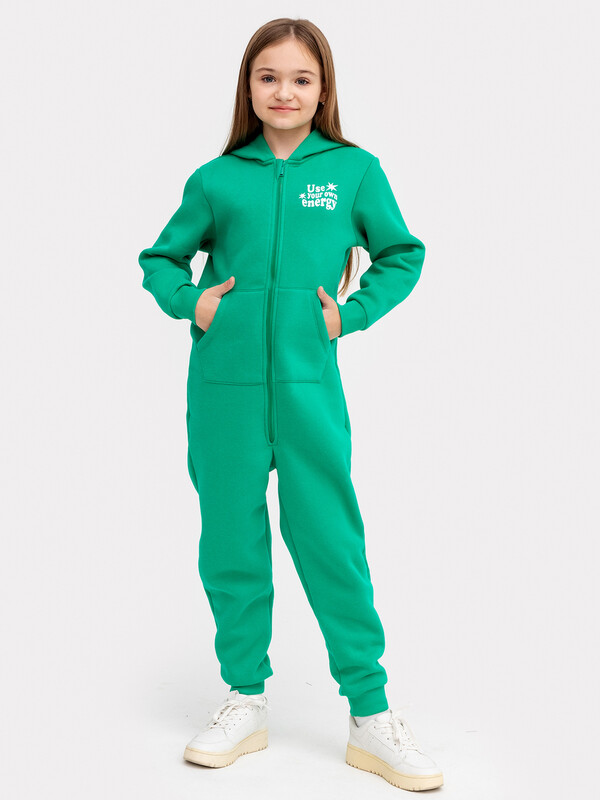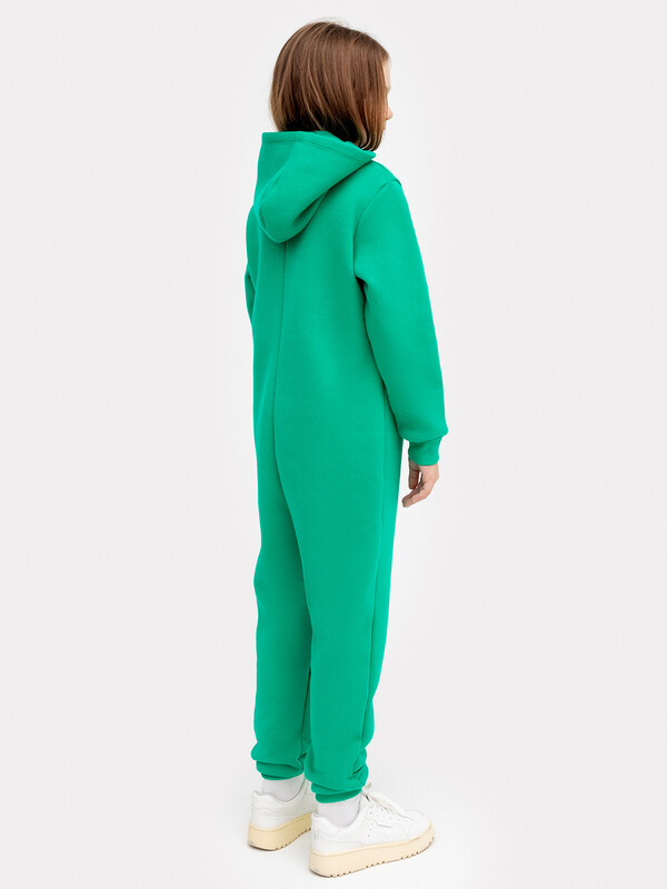 Детский комбинезон из трикотажного футера с теплым подчесом. Комбинезон свободной формы, застегивается на молнию. Верхняя часть – в виде худи с капюшоном и карманом-кенгуру, нижняя часть – свободные брюки на манжетах. Спущенная линия плеча и углубленная пройма гарантируют особый комфорт. Отличный выбор!
