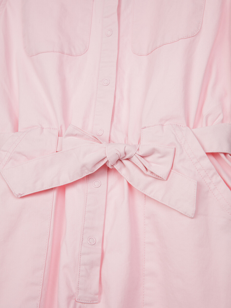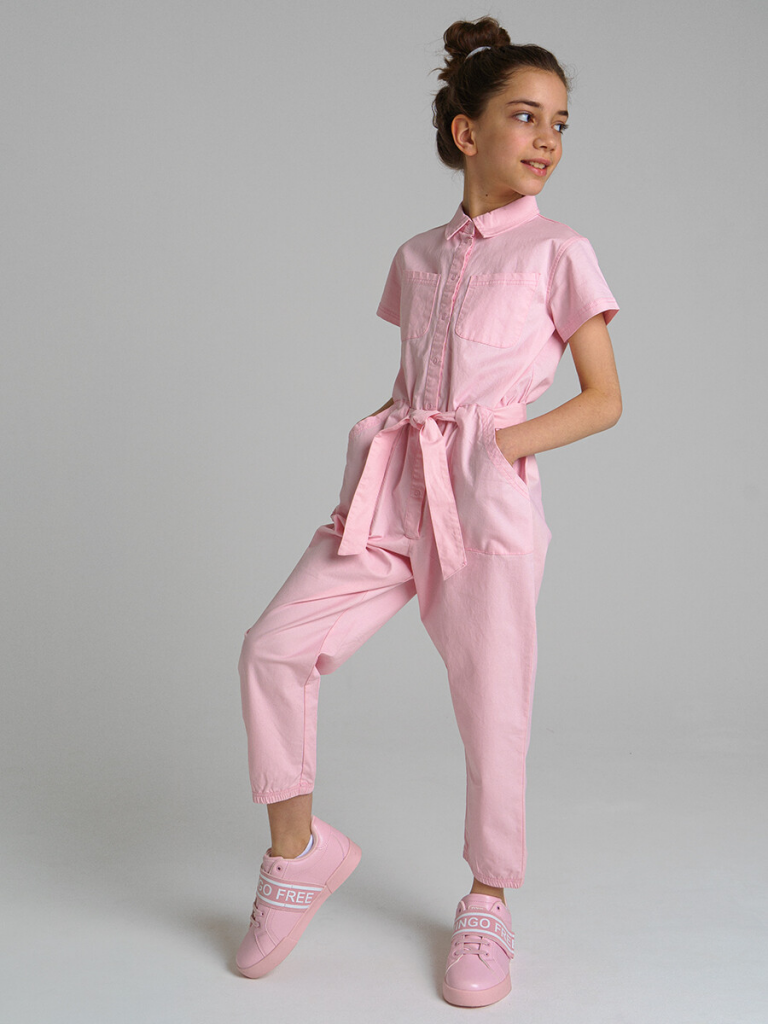 Комбинезон с поясом из твила. Размер изделия на фото - 140, параметры модели (см): рост 141, обхват груди-талии-бедер: 64-56-66. Высокое содержание хлопка 98%. Благодаря наличию эластана в составе ткани изделие проще в уходе и держит форму.