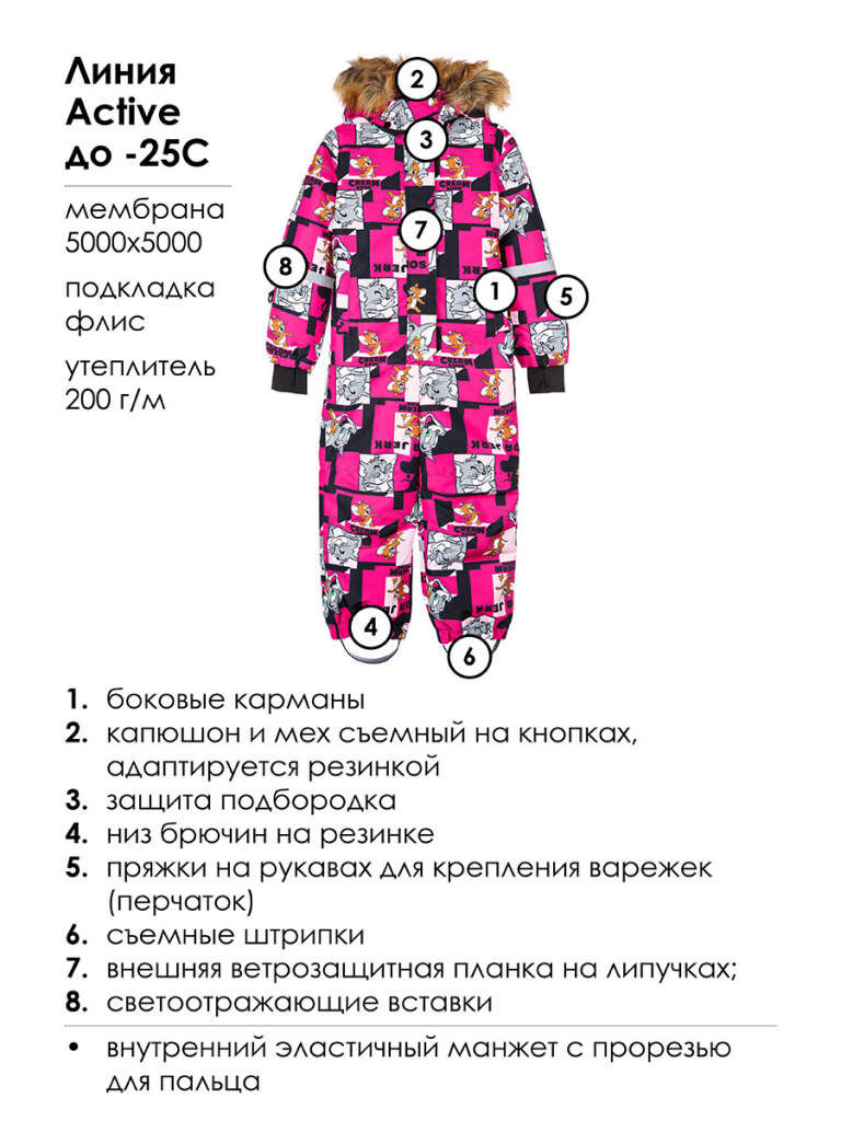 Зимний детский комбинезон для девочки. Особенности модели: Линия Active, Температурный режим до -25С, мембрана 5000х5000, подкладка - флис,Утеплитель 200 г/м2, боковые карманы,капюшон и мех съемный на кнопках, адаптируется резинкой,защита подбородка,низ брючин на резинке,внутренний эластичный манжет с прорезью для пальца,пряжки на рукавах для крепления варежек (перчаток),съемные штрипки,внешняя ветрозащитная планка на липучках, светоотражающие вставки, Утепленный горнолыжный комбинезон - идеальный выбор для активного отдыха на свежем воздухе в зимний период. Инновационный утеплитель и флисовая подкладка сохраняют тепло морозную погоду.Мембранный материал делает этот яркий и модный комбинезон непромокаемым: мембрана не пропускает влагу снаружи, но выводит её изнутри, что крайне важно во время подвижных игр и занятий спортом.Легкий, теплый и удобный, комбинезон идеально подходит для спорта, лыж, сноуборда и игр на свежем воздухе в холодный период года: зима, поздняя осень и ранняя весна.*Пожалуйста, обратите внимание, что указанный температурный режим является приблизительным и зависит от многих факторов, таких как возраст, физическое состояние, уровень активности ребенка и количество слоев одежды. Время, проведенное на открытом воздухе, и погодные условия, такие как холодный ветер, могут повлиять на тепловые характеристики изделия. Убедитесь, что защищены от холода голова, руки и ноги.