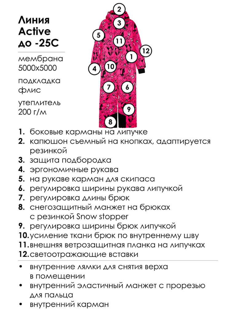 Зимний горнолыжный комбинезон для девочки подростка. Особенности модели: Линия Active, Температурный режим до -25С, мембрана 5000х5000, подкладка - флис,Утеплитель 200 г/м2, боковые карманы на липучке,капюшон съемный на кнопках, адаптируется резинкой,защита подбородка,эргономичные рукава,на рукаве карман для скипаса,регулировка ширины рукава липучкой,снегозащитный манжет на брюках с резинкой Snow stopper,регулировка ширины брюк липучкой,усиление ткани по внутреннему шву, внутренние лямки для снятия верха в помещении,внутренний эластичный манжет с прорезью для пальца, внутренний карман,внешняя ветрозащитная планка на липучках, светоотражающие вставки, Утепленный горнолыжный комбинезон - идеальный выбор для активного отдыха на свежем воздухе в зимний период. Инновационный утеплитель и флисовая подкладка сохраняют тепло морозную погоду.Мембранный материал делает этот яркий и модный комбинезон непромокаемым: мембрана не пропускает влагу снаружи, но выводит её изнутри, что крайне важно во время подвижных игр и занятий спортом.Легкий, теплый и удобный, комбинезон идеально подходит для спорта, лыж, сноуборда и игр на свежем воздухе в холодный период года: зима, поздняя осень и ранняя весна.*Пожалуйста, обратите внимание, что указанный температурный режим является приблизительным и зависит от многих факторов, таких как возраст, физическое состояние, уровень активности ребенка и количество слоев одежды. Время, проведенное на открытом воздухе, и погодные условия, такие как холодный ветер, могут повлиять на тепловые характеристики изделия. Убедитесь, что защищены от холода голова, руки и ноги.