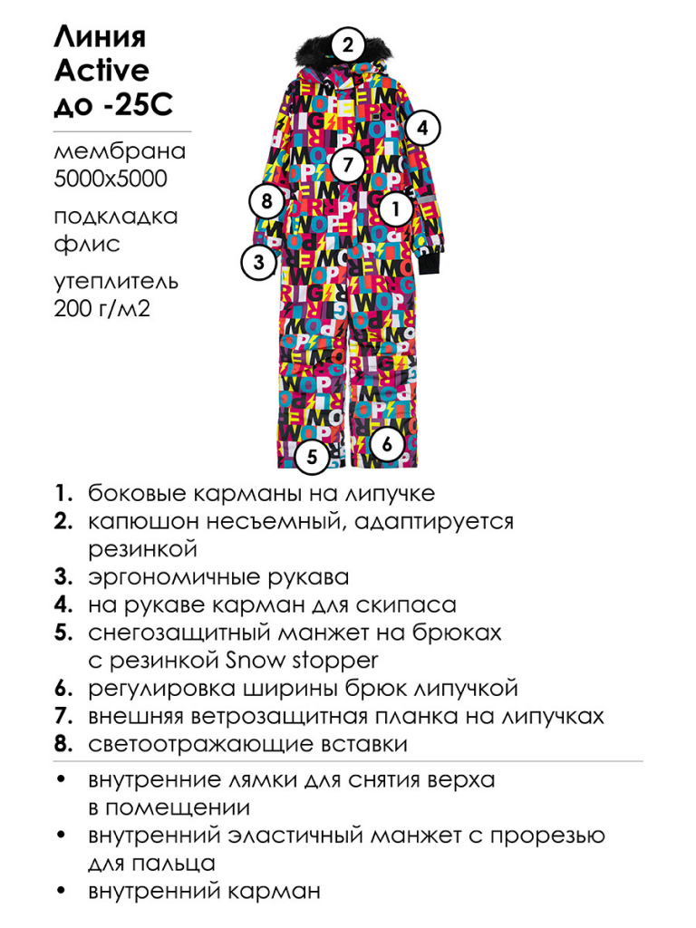Зимний горнолыжный комбинезон для девочки подростка. Особенности модели: Линия Active, Температурный режим до -25С, мембрана 5000х5000, подкладка - флис,Утеплитель 200 г/м2, боковые карманы на липучке,капюшон несъемный, адаптируется резинкой, внутренние лямки для снятия верха в помещении,эргономичные рукава,на рукаве карман для скипаса,снегозащитный манжет на брюках с резинкой Snow stopper,регулировка ширины брюк липучкой,внутренний эластичный манжет с прорезью для пальца, внутренний карман,внешняя ветрозащитная планка на липучках, светоотражающие вставки, Утепленный горнолыжный комбинезон - идеальный выбор для активного отдыха на свежем воздухе в зимний период. Инновационный утеплитель и флисовая подкладка сохраняют тепло морозную погоду.Мембранный материал делает этот яркий и модный комбинезон непромокаемым: мембрана не пропускает влагу снаружи, но выводит её изнутри, что крайне важно во время подвижных игр и занятий спортом.Легкий, теплый и удобный, комбинезон идеально подходит для спорта, лыж, сноуборда и игр на свежем воздухе в холодный период года: зима, поздняя осень и ранняя весна.*Пожалуйста, обратите внимание, что указанный температурный режим является приблизительным и зависит от многих факторов, таких как возраст, физическое состояние, уровень активности ребенка и количество слоев одежды. Время, проведенное на открытом воздухе, и погодные условия, такие как холодный ветер, могут повлиять на тепловые характеристики изделия. Убедитесь, что защищены от холода голова, руки и ноги.