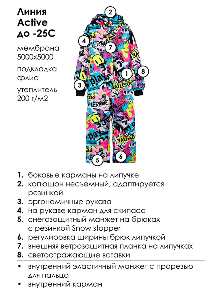Зимний комбинезон для девочки подростка. Особенности модели: Линия Active, Температурный режим до -25С, мембрана 5000х5000, подкладка - флис,Утеплитель 200 г/м, боковые карманы на липучке,капюшон несъемный, адаптируется резинкой,эргономичные рукава,на рукаве карман для скипаса,снегозащитный манжет на брюках с резинкой Snow stopper,регулировка ширины брюк липучкой,внутренний эластичный манжет с прорезью для пальца, внутренний карман,внешняя ветрозащитная планка на липучках, Утепленный горнолыжный комбинезон - идеальный выбор для активного отдыха на свежем воздухе в зимний период. Инновационный утеплитель и флисовая подкладка сохраняют тепло морозную погоду.Мембранный материал делает этот яркий и модный комбинезон непромокаемым: мембрана не пропускает влагу снаружи, но выводит её изнутри, что крайне важно во время подвижных игр и занятий спортом. Легкий, теплый и удобный, комбинезон идеально подходит для спорта, лыж, сноуборда и игр на свежем воздухе в холодный период года: зима, поздняя осень и ранняя весна. *Пожалуйста, обратите внимание, что указанный температурный режим является приблизительным и зависит от многих факторов, таких как возраст, физическое состояние, уровень активности ребенка и количество слоев одежды. Время, проведенное на открытом воздухе, и погодные условия, такие как холодный ветер, могут повлиять на тепловые характеристики изделия. Убедитесь, что защищены от холода голова, руки и ноги.