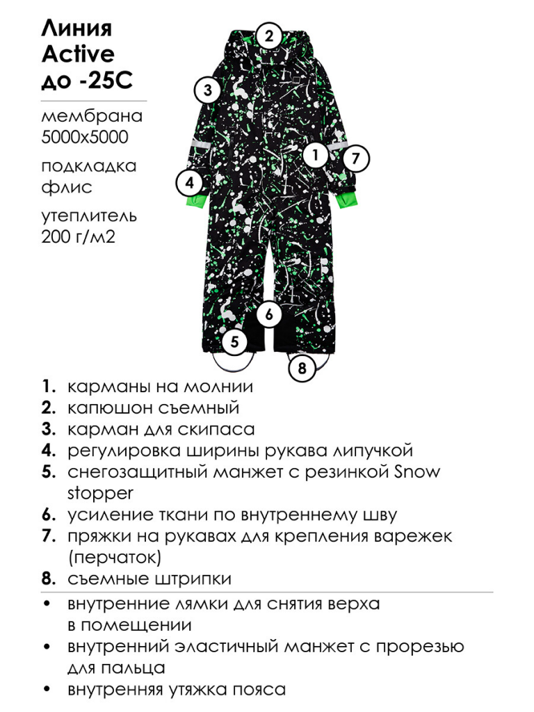Зимний детский комбинезон для мальчика. Особенности модели: Линия Active, Температурный режим до -25С, мембрана 5000х5000, подкладка - флис,Утеплитель 200 г/м, боковые карманы на молнии,капюшон съемный на кнопках, регулируется резинкой со стопперами,защита подбородка при застегивании молнии,эргономичные рукава,на рукаве карман для скипаса,регулировка ширины рукава липучкой,снегозащитный манжет на брюках с резинкой Snow stopper, регулировка длины брюк,регулировка ширины брюк липучкой,усиление ткани по внутреннему шву, внутренние лямки для снятия верха в помещении,внутренний эластичный манжет с прорезью для пальца,внутренняя утяжка пояса,пряжки на рукавах для крепления варежек (перчаток),съемные штрипки,внешняя ветрозащитная планка на липучках, Детский утепленный горнолыжный комбинезон - идеальный выбор для активного отдыха на свежем воздухе в зимний период. Инновационный утеплитель и флисовая подкладка сохраняют тепло морозную погоду.Мембранный материал делает этот яркий и модный комбинезон непромокаемым: мембрана не пропускает влагу снаружи, но выводит её изнутри, что крайне важно во время подвижных игр и занятий спортом. Легкий, теплый и удобный, комбинезон идеально подходит для спорта, лыж, сноуборда и игр на свежем воздухе в холодный период года: зима, поздняя осень и ранняя весна. *Пожалуйста, обратите внимание, что указанный температурный режим является приблизительным и зависит от многих факторов, таких как возраст, физическое состояние, уровень активности ребенка и количество слоев одежды. Время, проведенное на открытом воздухе, и погодные условия, такие как холодный ветер, могут повлиять на тепловые характеристики изделия. Убедитесь, что защищены от холода голова, руки и ноги.
