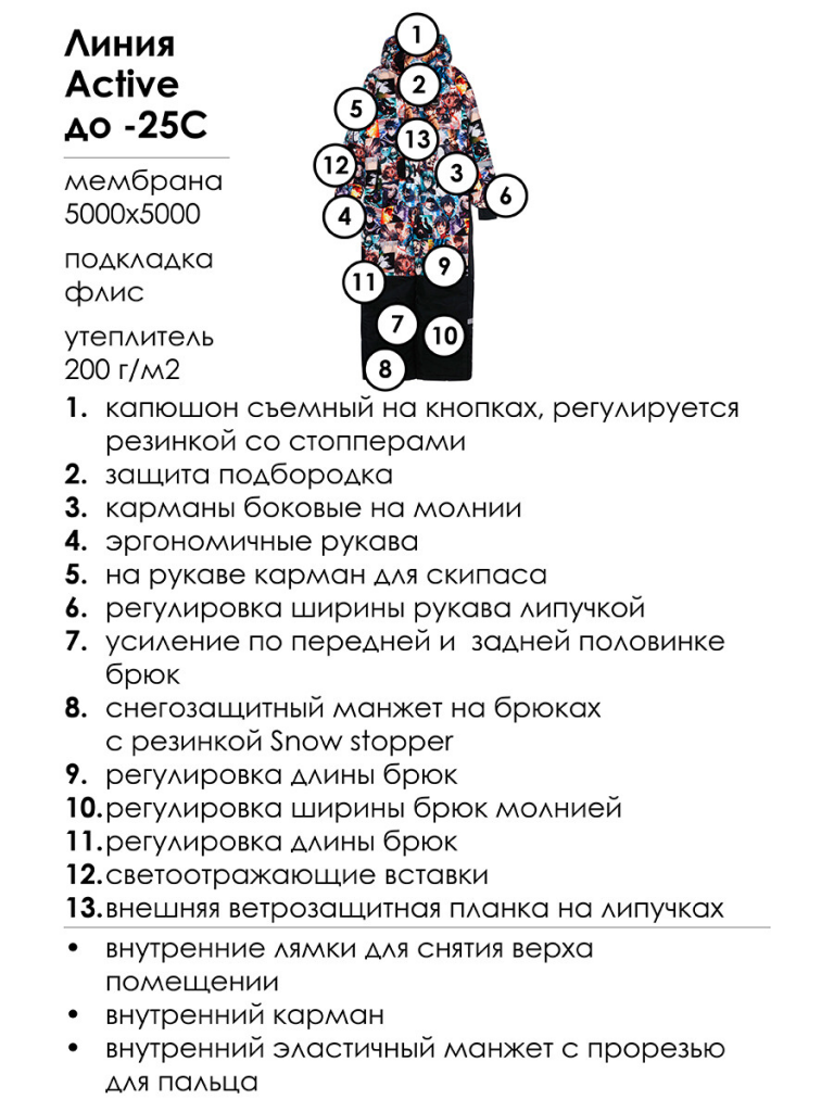 Зимний комбинезон для мальчика подростка. Особенности модели:Линия Active, Температурный режим до -25С, мембрана 5000х5000, подкладка - флис,Утеплитель 200 г/м,капюшон съемный на кнопках, регулируется резинкой со стопперами,защита подбородка при застегивании молнии,подкладка - флис, внутренние лямки для снятия верха в помещении,карманы боковые на молнии, внутренний карман,эргономичные рукава,на рукаве карман для скипаса,внутренний эластичный манжет с прорезью для пальца,регулировка ширины рукава липучкой,усиление по передней и задней половинке брюк,снегозащитный манжет на брюках с резинкой Snow stopper,регулировка длины брюк,регулировка ширины брюк молнией, регулировка длины брюк,светоотражающие элементы,внешняя ветрозащитная планка на липучках, Утепленный горнолыжный комбинезон - идеальный выбор для активного отдыха на свежем воздухе в зимний период. Инновационный утеплитель и флисовая подкладка сохраняют тепло морозную погоду.Мембранный материал делает этот яркий и модный комбинезон непромокаемым: мембрана не пропускает влагу снаружи, но выводит её изнутри, что крайне важно во время подвижных игр и занятий спортом. Легкий, теплый и удобный, комбинезон идеально подходит для спорта, лыж, сноуборда и игр на свежем воздухе в холодный период года: зима, поздняя осень и ранняя весна. *Пожалуйста, обратите внимание, что указанный температурный режим является приблизительным и зависит от многих факторов, таких как возраст, физическое состояние, уровень активности ребенка и количество слоев одежды. Время, проведенное на открытом воздухе, и погодные условия, такие как холодный ветер, могут повлиять на тепловые характеристики изделия. Убедитесь, что защищены от холода голова, руки и ноги.