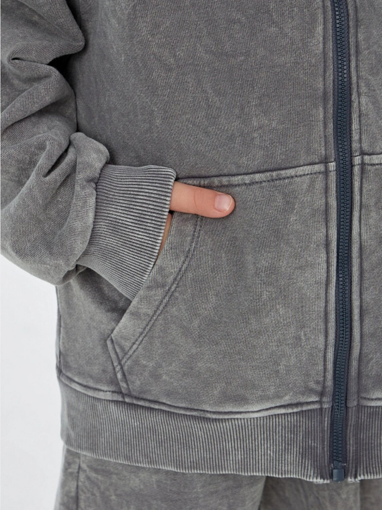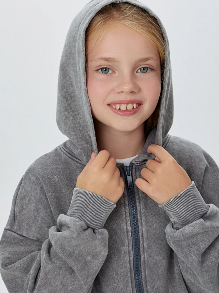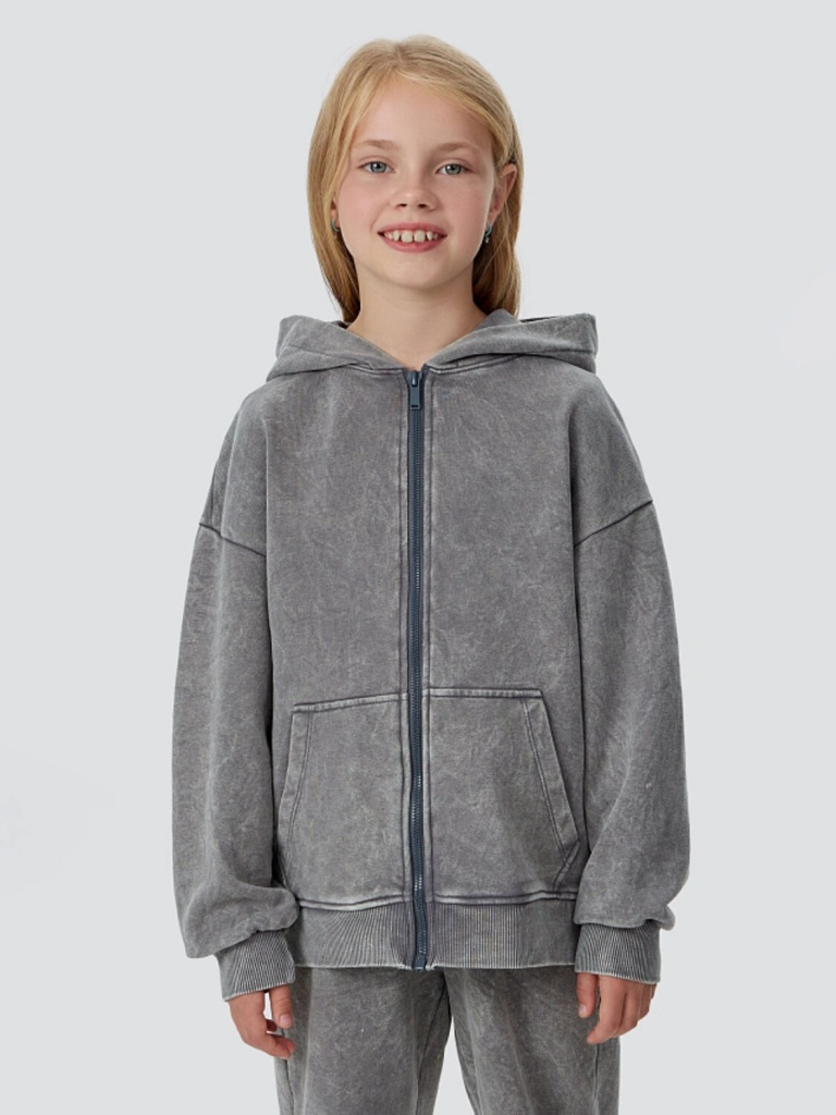 Серый костюм для девочек с обработкой acid wash — это стиль и комфорт для вашей малышки. Acid wash — это особая техника, которая создает мягкие размытые эффекты и винтажный вид. Каждый комплект уникален благодаря неравномерному окрашиванию, ткань становится особенно мягкой, а рисунок не выцветает со временем.
