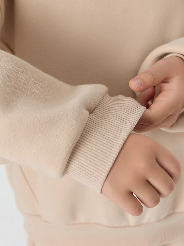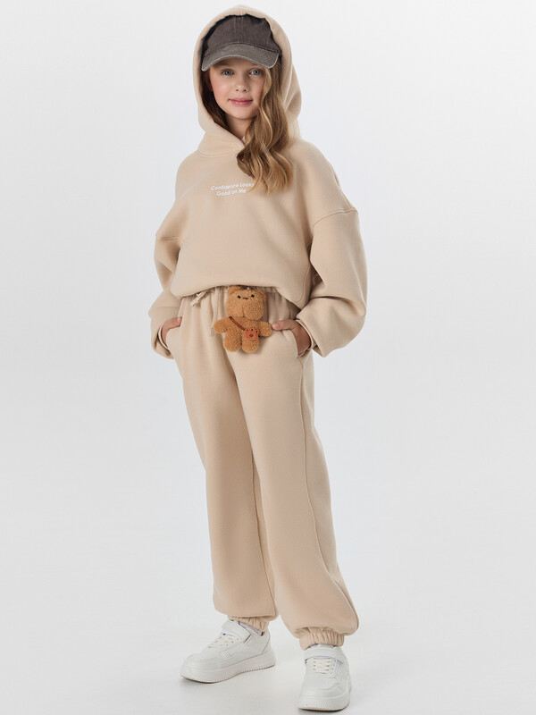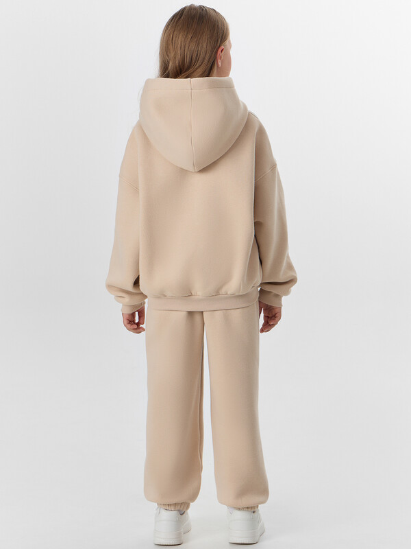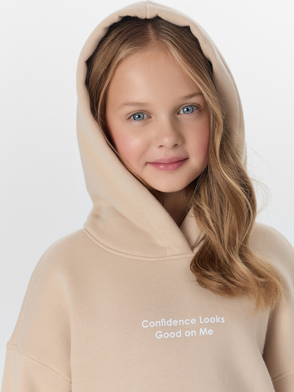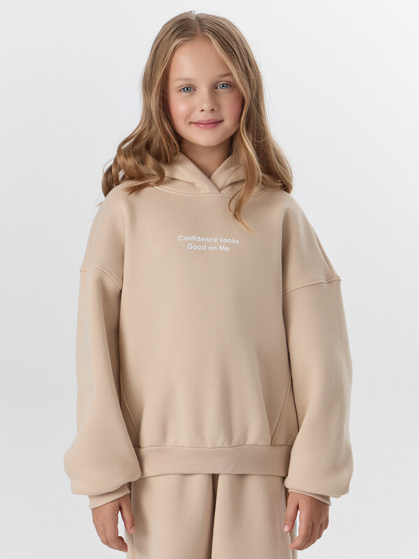 Худи для девочек, свободного силуэта (оверсайз), с капюшоном. Горловина округлой формы. Капюшон со средним швом, на подкладке из основного полотна. Плечо спущено, рукав втачной длинный. Боковые швы перенесены вперед. По низу рукава отрезная манжета из рибаны.
