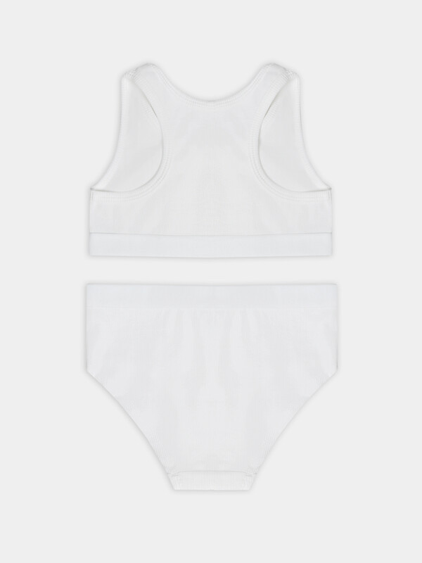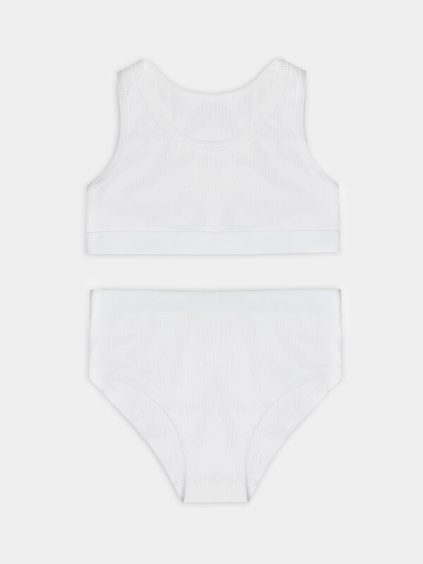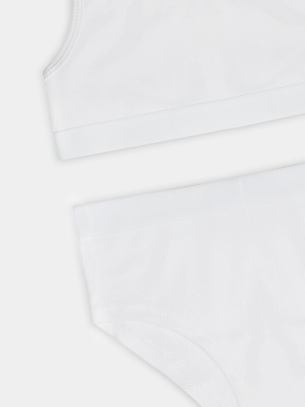 Трусики выполнены из того же дышащего материала, что и топ. Мягкая обработка швов предотвращает натирание, а эластичная тесьма по верхнему краю надежно фиксирует изделие. Комплект нижнего белья для девочки подходит для повседневной носки, занятий спортом или отдыха. Этот детский комплект сочетает практичность и стиль: лаконичный дизайн без лишних деталей, качественные материалы и продуманная конструкция. Вы можете купить комплект нижнего белья для девочки для активного образа жизни, где важны удобство, свобода движений и комфорт.