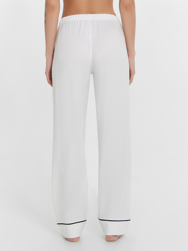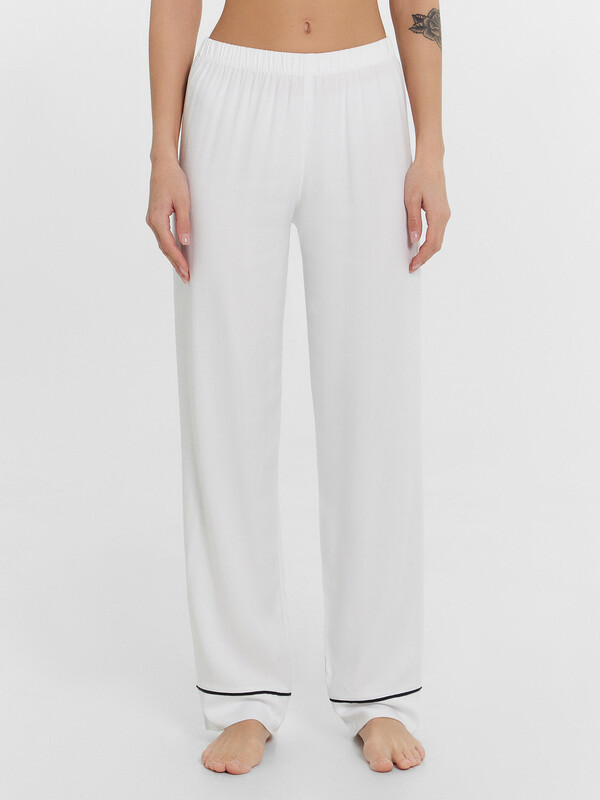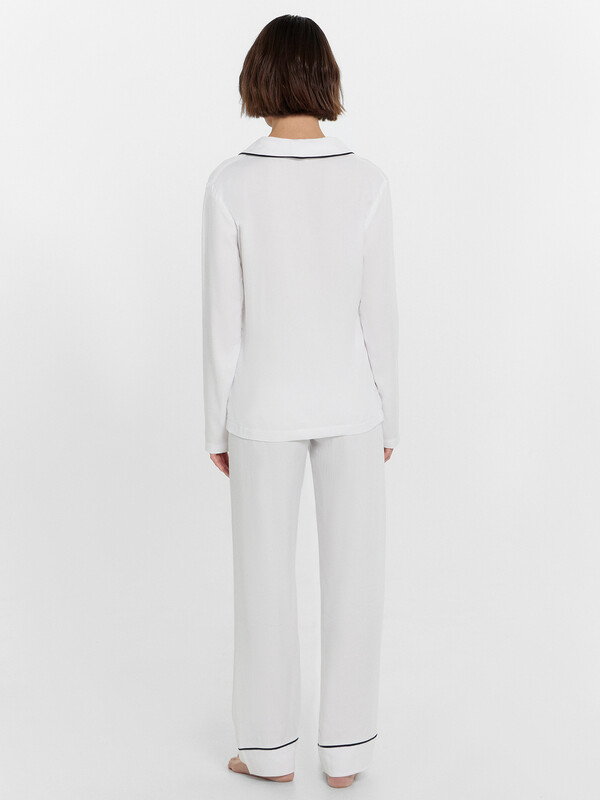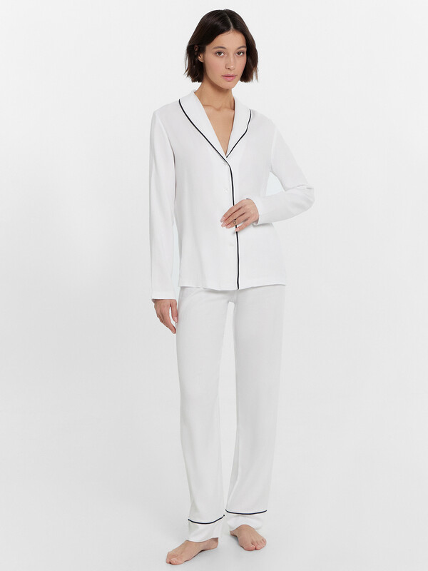 Пижамный комплект женский из жакета и брюк, выполненных из вискозного трикотажа. Жакет длиной до середины ягодиц, прямого силуэта, с V-образной горловиной, длинными рукавами на манжетах и немного спущенной линией плеча. По центру жакет застегивается на пуговицы. Брюки длинные, свободные, на манжетах и с эластичной резиной в поясе. Комфортный и очень приятный в носке — ваш лучший вариант на любой сезон года. Идеален в качестве домашней одежды. Так выглядит комфорт!