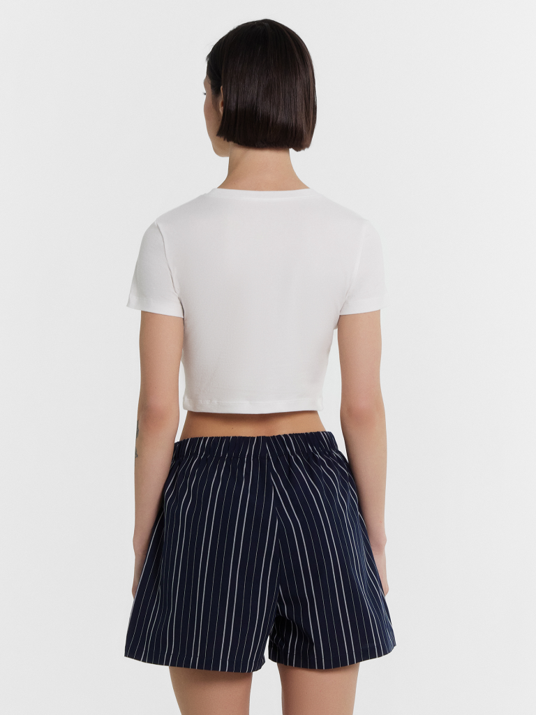 Футболка женская прилегающего силуэта. Горловина круглой формы, горловина окантована бейкой из основного полотна. Рукав втачной короткий. Футболка укороченная.