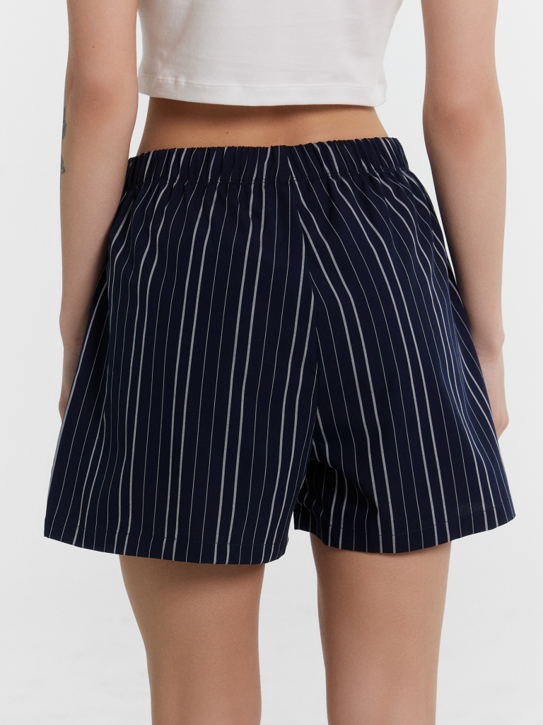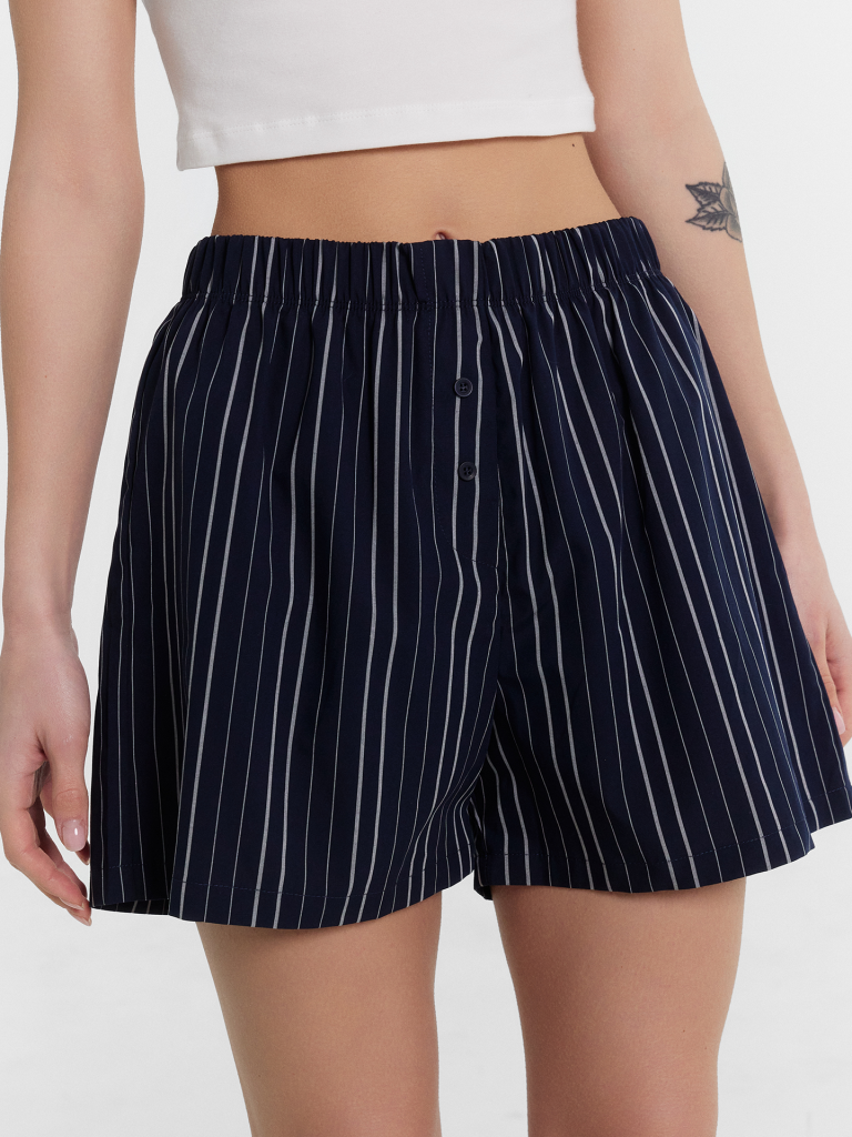Шорты свободного силуэта. Пояс цельнокроеный, с эластичной тесьмой внутри 40RV. На передней половинке обработана планка с имитацией застежки и с двумя пуговицами d=10 мм . Нижние срезы обработаны швом в подгибку. декор по заданию