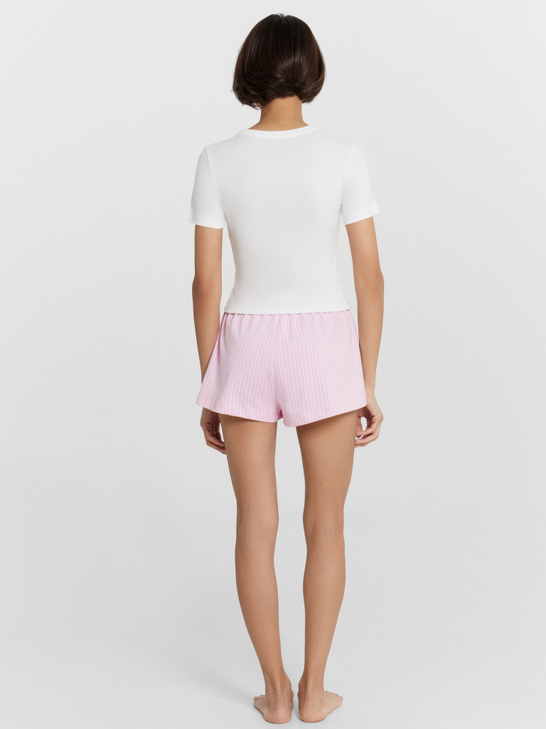 Этот домашний комплект — яркое и удобное решение для отдыха и повседневной носки дома. Футболка прилегающего силуэта, украшенная надписью из страз "Ты не попал в хит-парад моих мыслей", добавляет образу оригинальности и игривого акцента. Круглая горловина и короткие рукава подчеркивают лаконичный дизайн, а обработка нижнего края и рукавов швом вподгибку обеспечивает аккуратность и долговечность изделия. Шорты свободного силуэта с эластичным поясом гарантируют комфортную посадку и свободу движений. Укороченная длина и обработанные нижние срезы делают шорты практичными и стильными, идеально подходящими для домашнего гардероба. Комплект выполнен из натурального хлопка, который обеспечивает мягкость, воздухопроницаемость и приятные ощущения на коже. Он идеально подходит для создания комфортного и стильного образа дома.