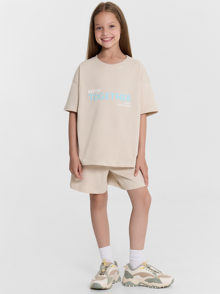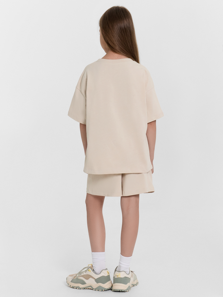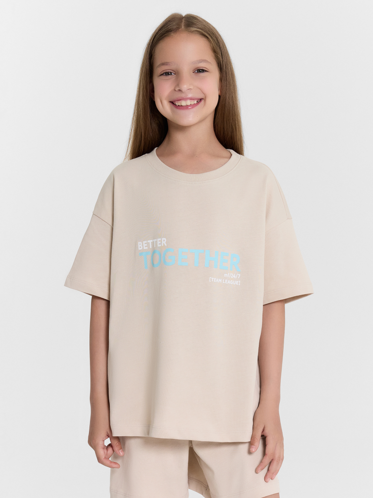 Футболка свободного силуэта. Перед и спинка цельнокроеные. Длина до середины бедра. Рукав втачной, короткий. Горловина круглой формы, обтачка из рибаны. Низ изделия и рукваов обработан на 2-х игольной плоскошовной машине швом в подгибку.