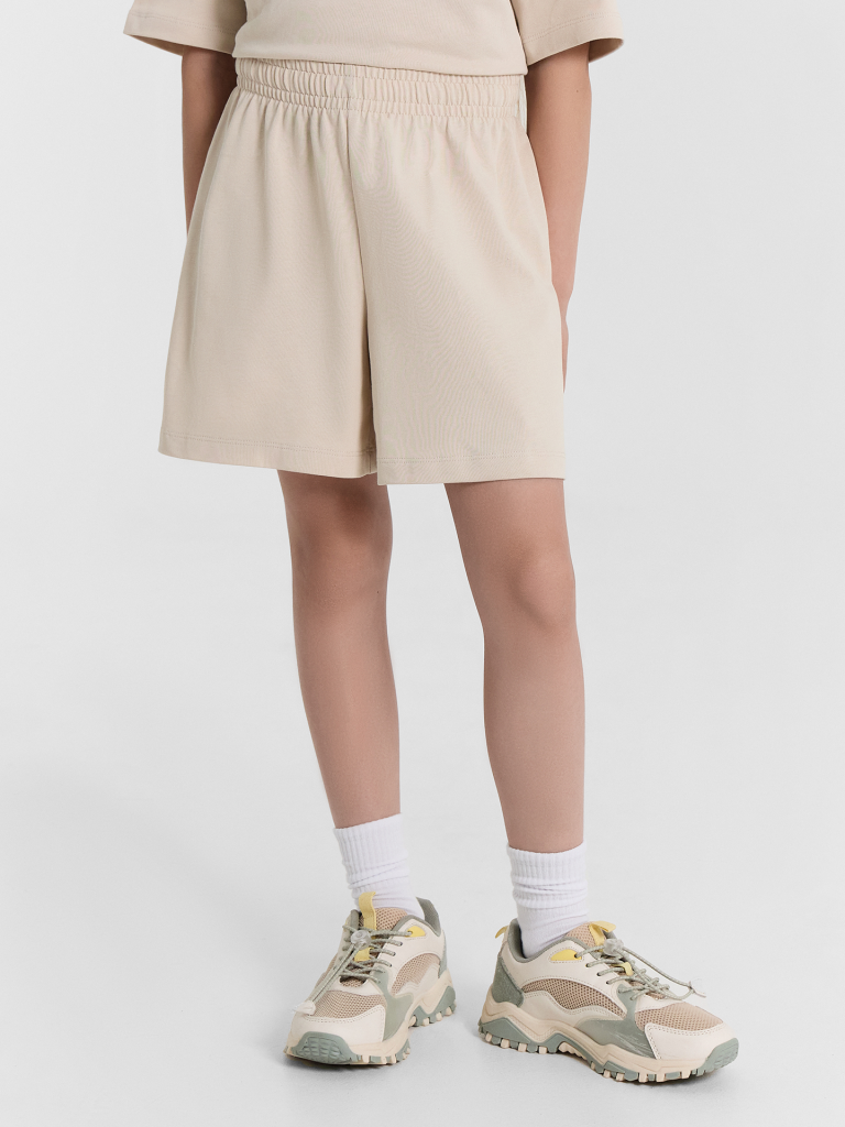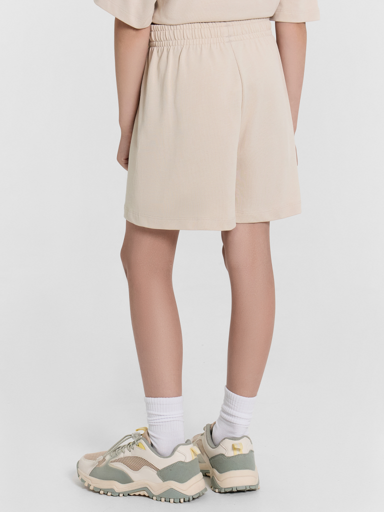 Шорты длиной немного выше колен. Пояс цельнокроеный, застрочен с эластичной резиной и распошит. Внутри по центру пояса пробиты петли, втянут шнур. Концы шнура застрочены. Низ шорт обработан швом в подгибку на 2-х игольной плоскошовной машине.