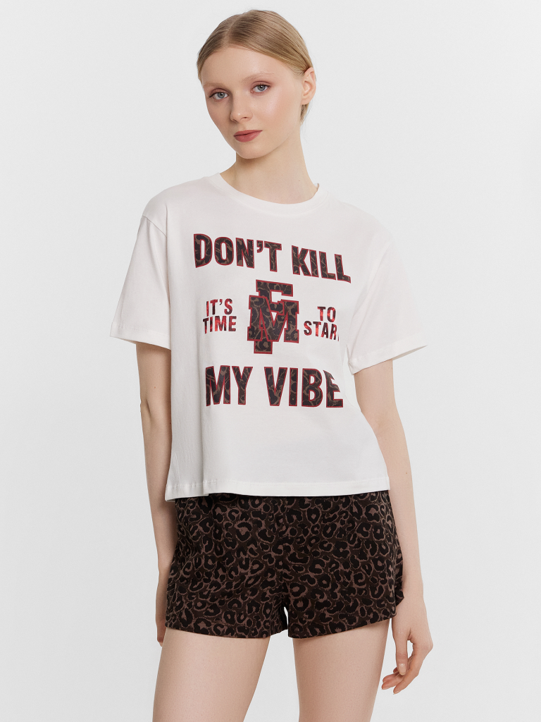 Комплект женский состоит из футболки и шорт. Футболка свободного силуэта. Горловина круглой формы, обтачка из основного полотна. Рукава втачные свободные, линия плеча слегка спущена. Низ рукавов и футболки в подгибку.