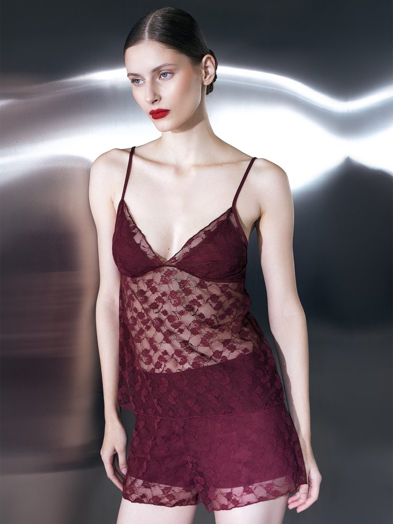 Комплект женский (блузка и шорты).Блузка полуприлегающего силуэта. Горловина V-образной формы, Детали чашек из основного полотна, обработаны бейкой. Бретели из основного полотна внутри силиконовая тесьма Si1-4, 4мм, с кольцами и регуляторами 6мм F27.19.06. Детали блузки оформлены кружевом, спинка из кружева. В боковых деталях чашки из кружева и спинки силиконовая тесьма Si1-4, 4мм. Край блузки из кружева обработан микрооверлоком.