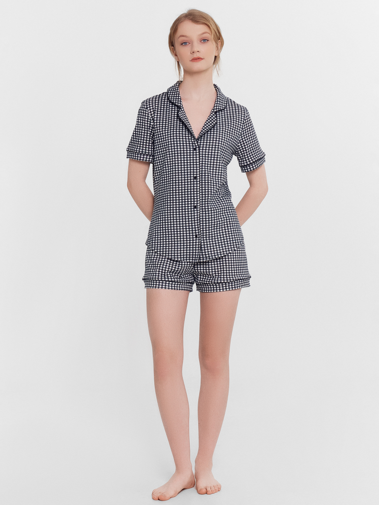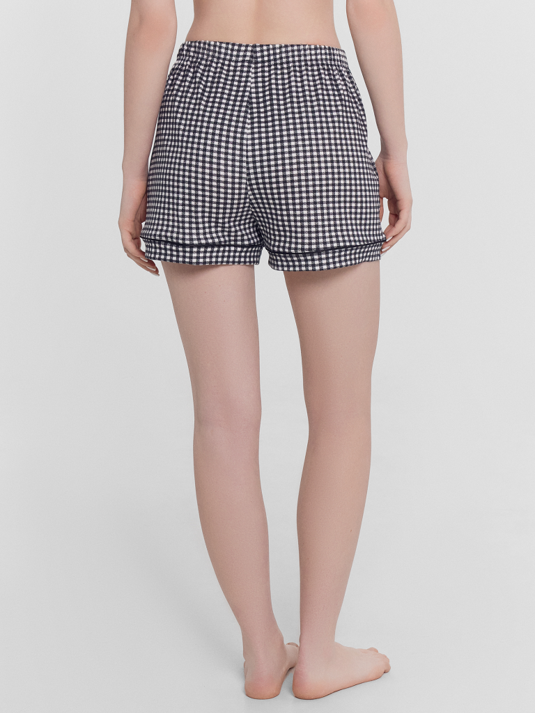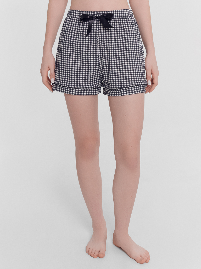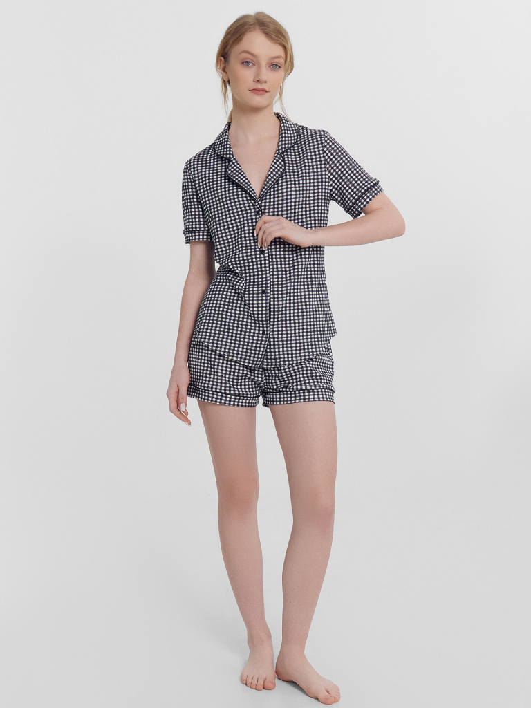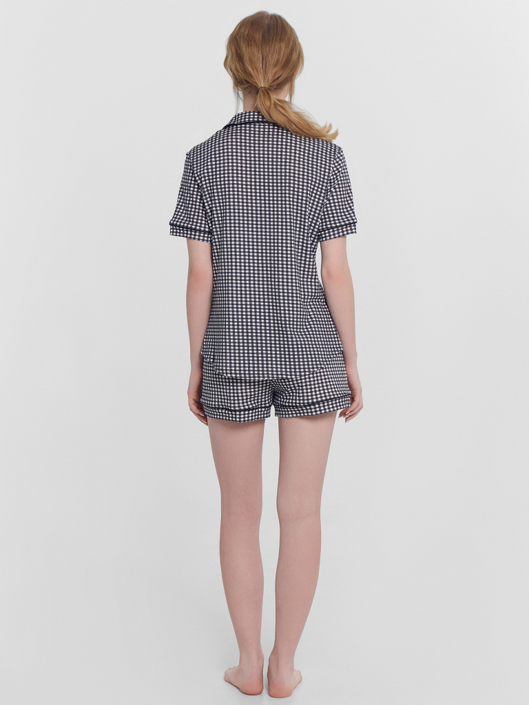 Хлопковый женский комплект актуального свободного силуэта. Рубашка прямая, с отложным воротником и лацканами, короткими рукавами, застегивается на пуговицы. Дополняют ее свободные шорты длины мини, с резиновой тесьмой в поясе и атласной тесьмой, которая завязывается на бантик. Особенность модели – контрастные канты на рукавах, воротнике и передней части рубашки. Рекомендуем для сна, отдыха и домашних дел!