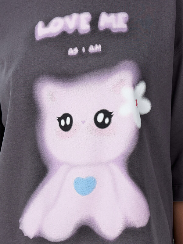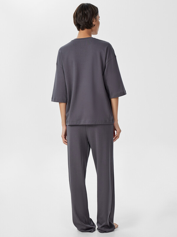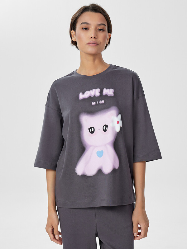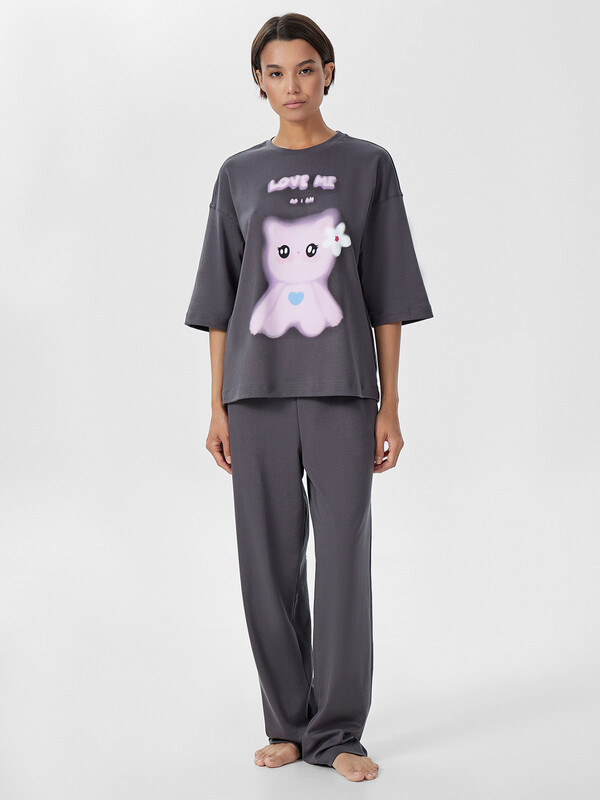 Серый домашний комплект с принтом "Love me" — это легкость, свобода и капля романтики, воплощенные в уютной одежде. Мягкая хлопковая ткань дарит телу приятные ощущения и позволяет коже дышать, а свободный крой делает каждый момент дома комфортным. Футболка с округлой горловиной и плавной линией плеч словно создана для расслабленного настроения: она не стесняет движения, оставляя ощущение простора и спокойствия. Нежный принт добавляет образу трогательный акцент — как признание в любви, которое всегда с вами. Прямые брюки продолжают идею непринужденности: пояс с эластичной тесьмой бережно фиксирует посадку, боковые карманы-хулиганы привносят в образ озорство, а подгибочный шов по низу изделия завершает его с аккуратной точностью. Этот комплект — не просто одежда для дома, а способ выразить себя даже в самых спокойных и личных моментах.