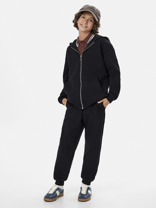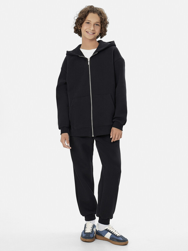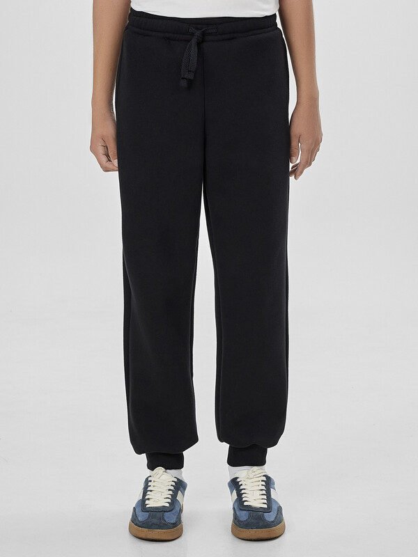 Брюки джоггеры свободные. Пояс отризной с эластичной тесьмой внутри 50RV. С внешней стороны пояса пробиты петли и втянут шнур 8PXC-2. Карманы в боковых швах. По низу отрезные манжеты из рибаны.