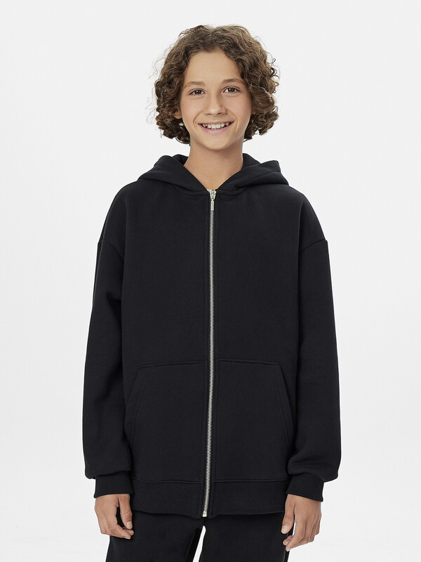 Рукава втачные длинные, плечо спущено. По низу рукава отрезная манжета из рибаны. Центральная застежка на тесьму молнию. По переду накладные карманы кенгуру.Пояс отрезной из рибаны.