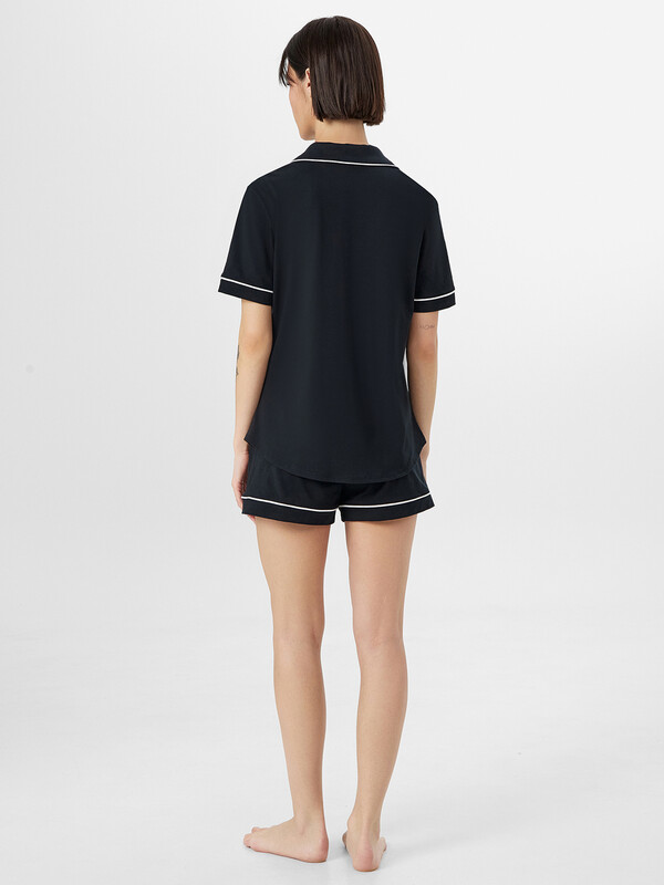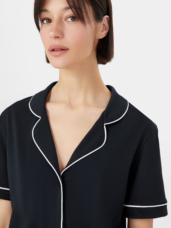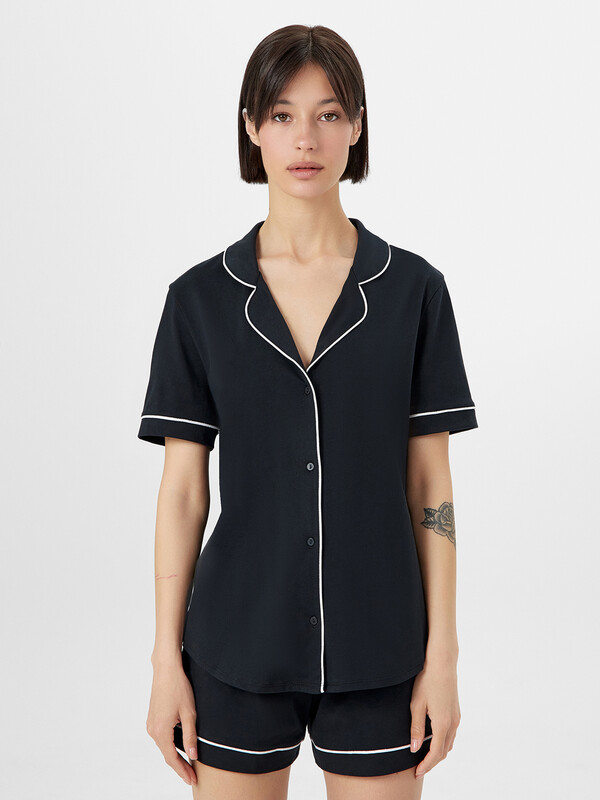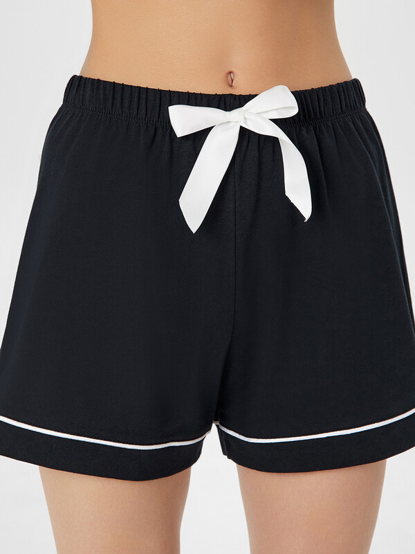 Хлопковый женский комплект актуального свободного силуэта. Рубашка прямая, с отложным воротником и лацканами, короткими рукавами, застегивается на пуговицы. Дополняют ее свободные шорты длины мини, с резиновой тесьмой в поясе и атласной тесьмой, которая завязывается на бантик. Особенность модели – контрастные канты на рукавах, воротнике и передней части рубашки. Рекомендуем для сна, отдыха и домашних дел!