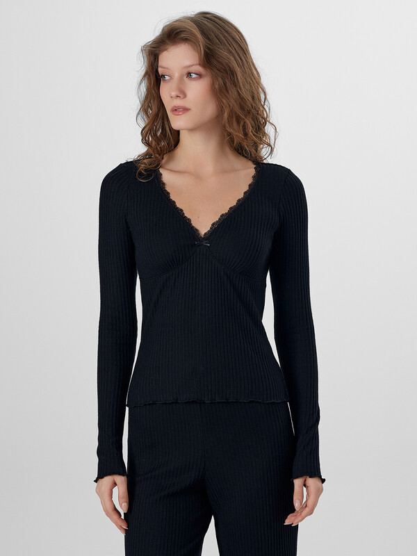Черный домашний комплект для женщин — элегантное решение для комфортного отдыха. Набор состоит из приталенного джемпера и прямых брюк, выполненных из мягкой вискозной ткани с добавлением полиэстера и эластана.