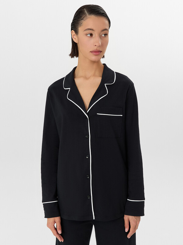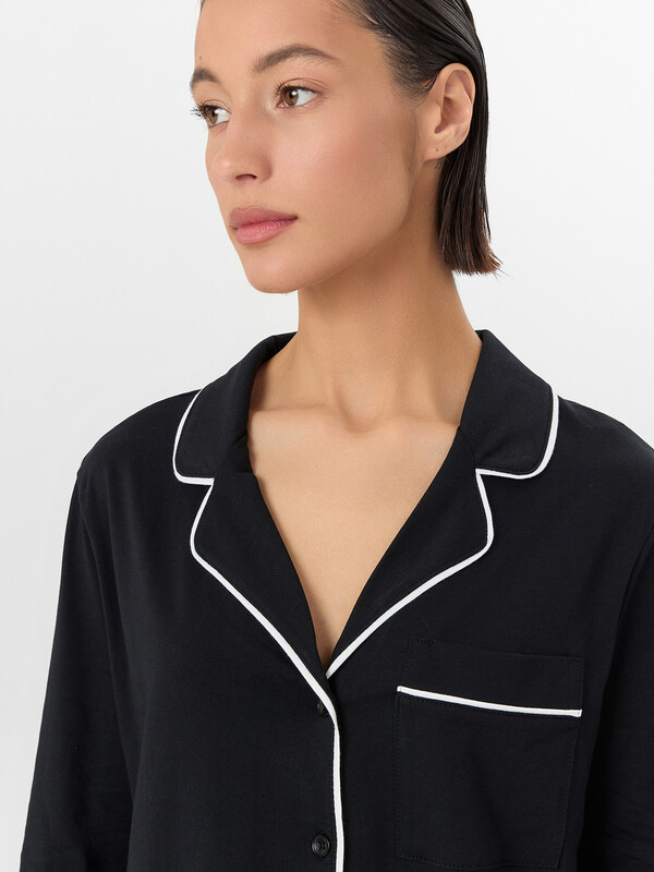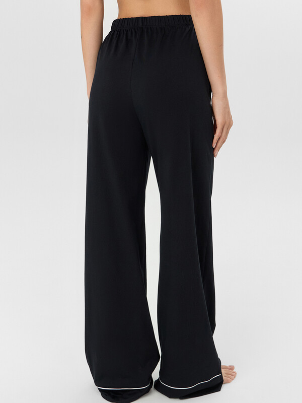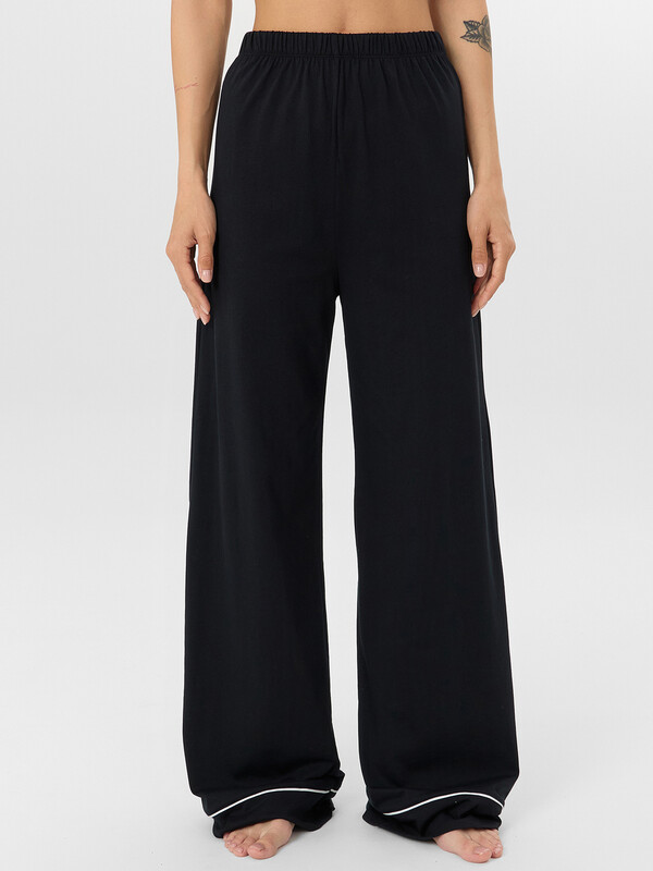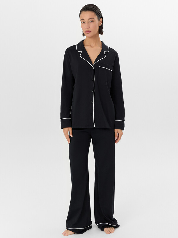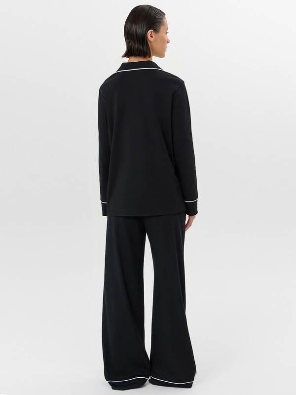Брюки прямого свободного кроя с средней посадкой на талии. Пояс с мягкой эластичной резинкой внутри не давит на живот, а отрезные манжеты по низу с кантами повторяют дизайн жакета. Пижама не раздражает кожу, сохраняет форму после стирок и дарит ощущение невесомости. Комплект подходит для ежедневного использования: мягкость ткани, продуманный крой и классический дизайн делают его универсальным вариантом для отдыха дома.