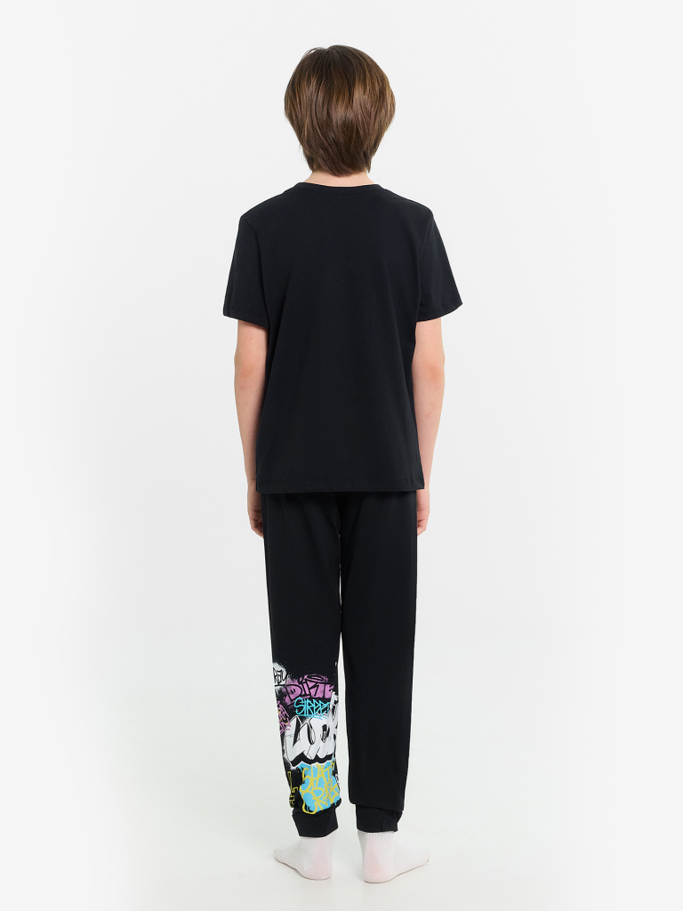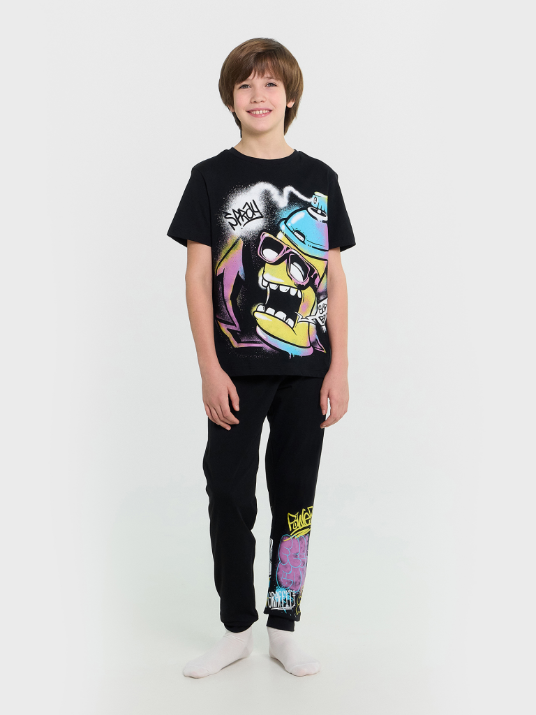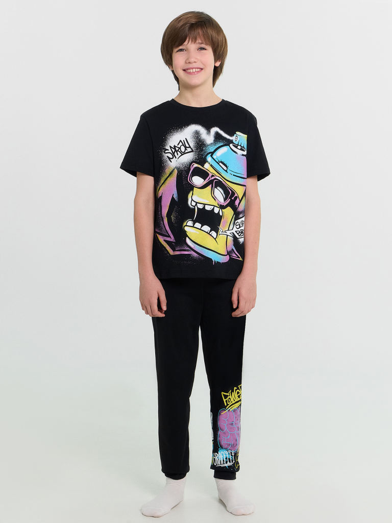 Стильная и уютная пижама для мальчиков, выполненная из хлопковой трикотажной кулирки. Материал обладает мягкостью и дышащими свойствами, обеспечивая комфорт. Комплект состоит из футболки с коротким рукавом и длинных брюк с эластичным поясом. Штанины завершаются манжетами, что добавляет удобства и стиля. Такая пижама станет отличным выбором для спокойного и комфортного сна вашего ребенка. Прекрасное сочетание стиля и уюта!