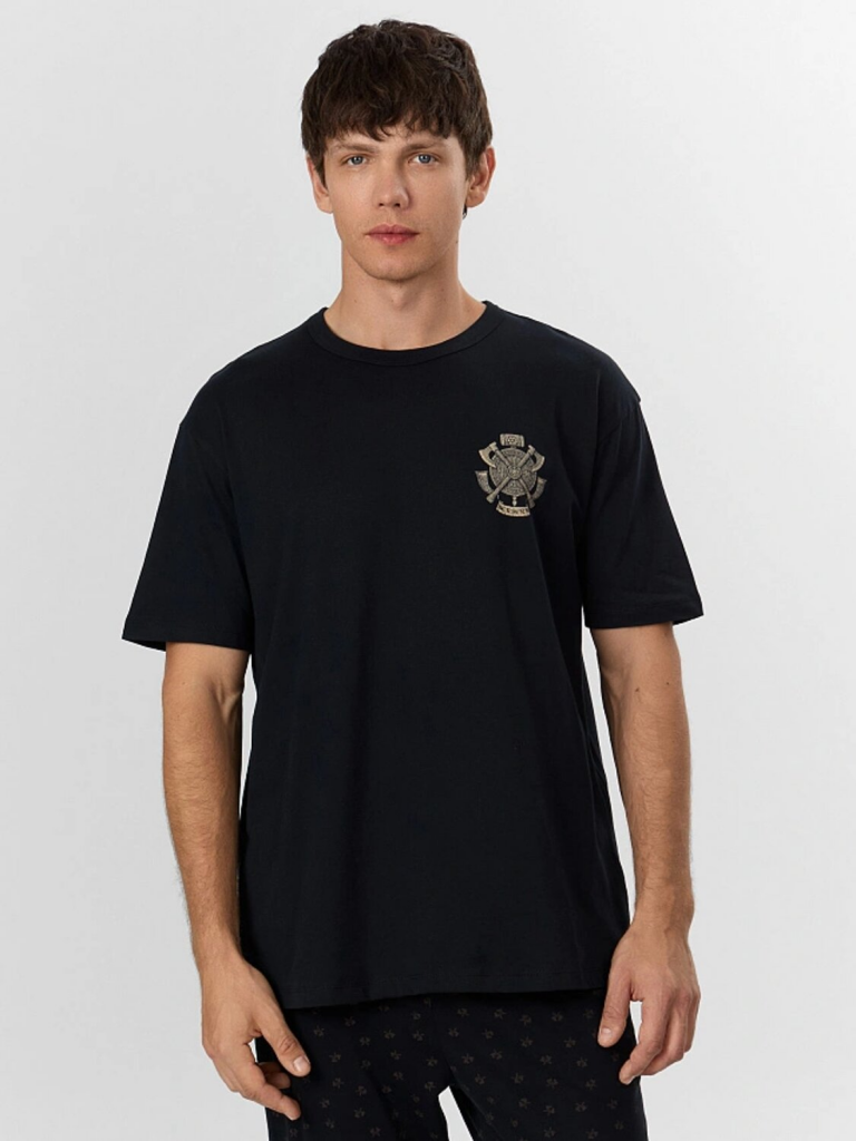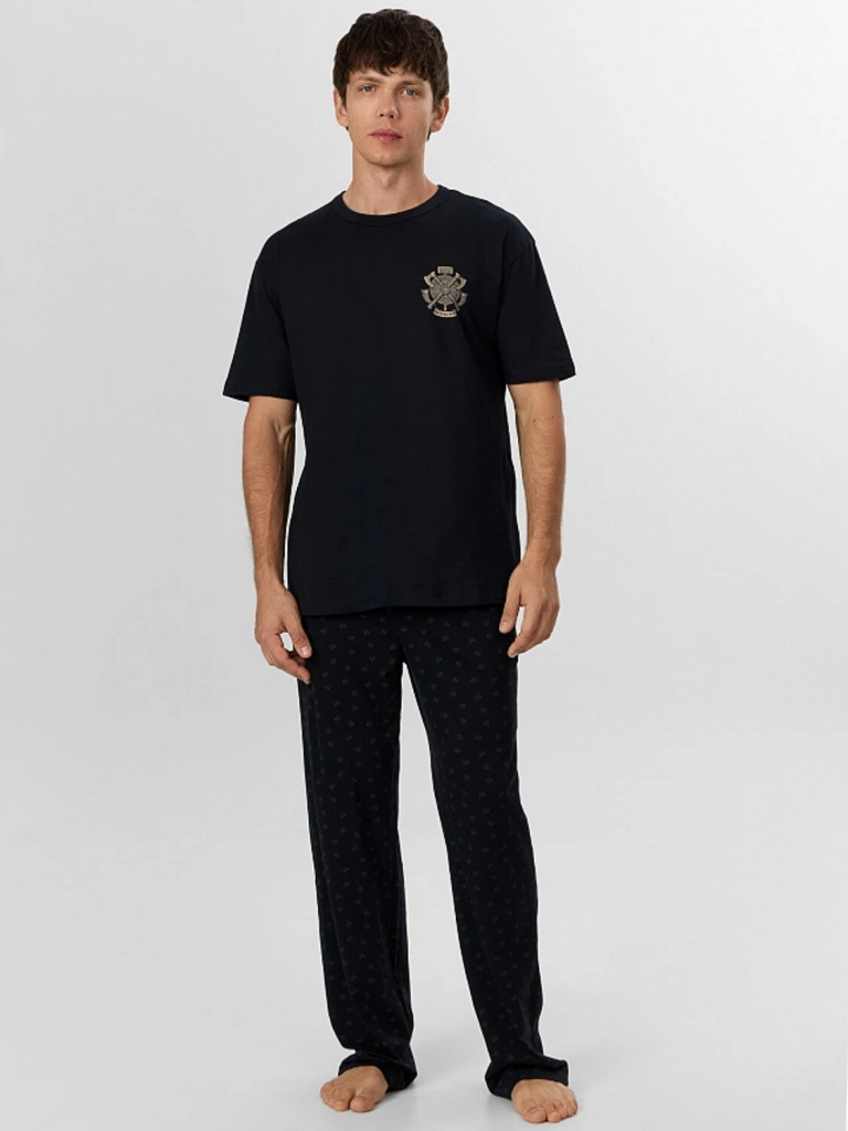 Комплект мужской домашний черный — это уютный набор для отдыха, созданный из мягкой трикотажной кулирки. Футболка свободного силуэта с круглой горловиной и удлиненными рукавами до локтя обеспечивает полную свободу движений. Спущенное плечо и аккуратная обработка швов исключают дискомфорт.