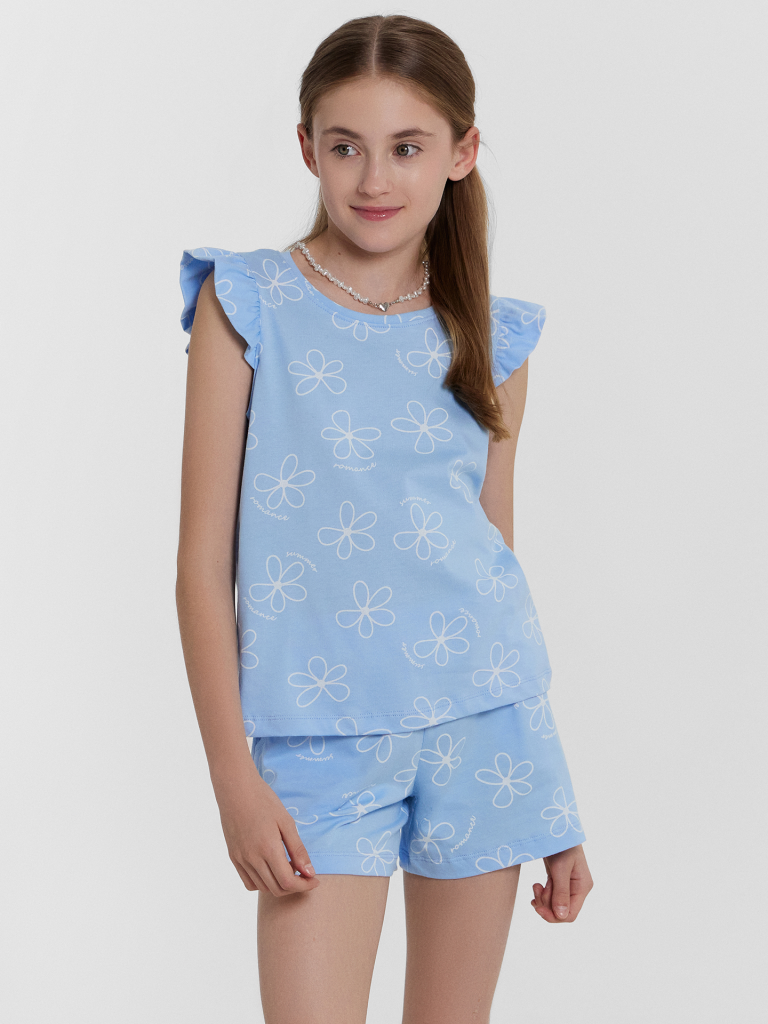 Легкий и привлекательный комплект из трикотажной кулирки. Включает необычную футболку и мини-шорты. Футболка прямого силуэта, длиной до середины ягодиц, с круглой горловиной и необычными короткими рукавами, украшенными рюшами. Шорты короткие, с боковыми карманами и эластичной резиной в поясе. наверняка понравится вашей девочке!