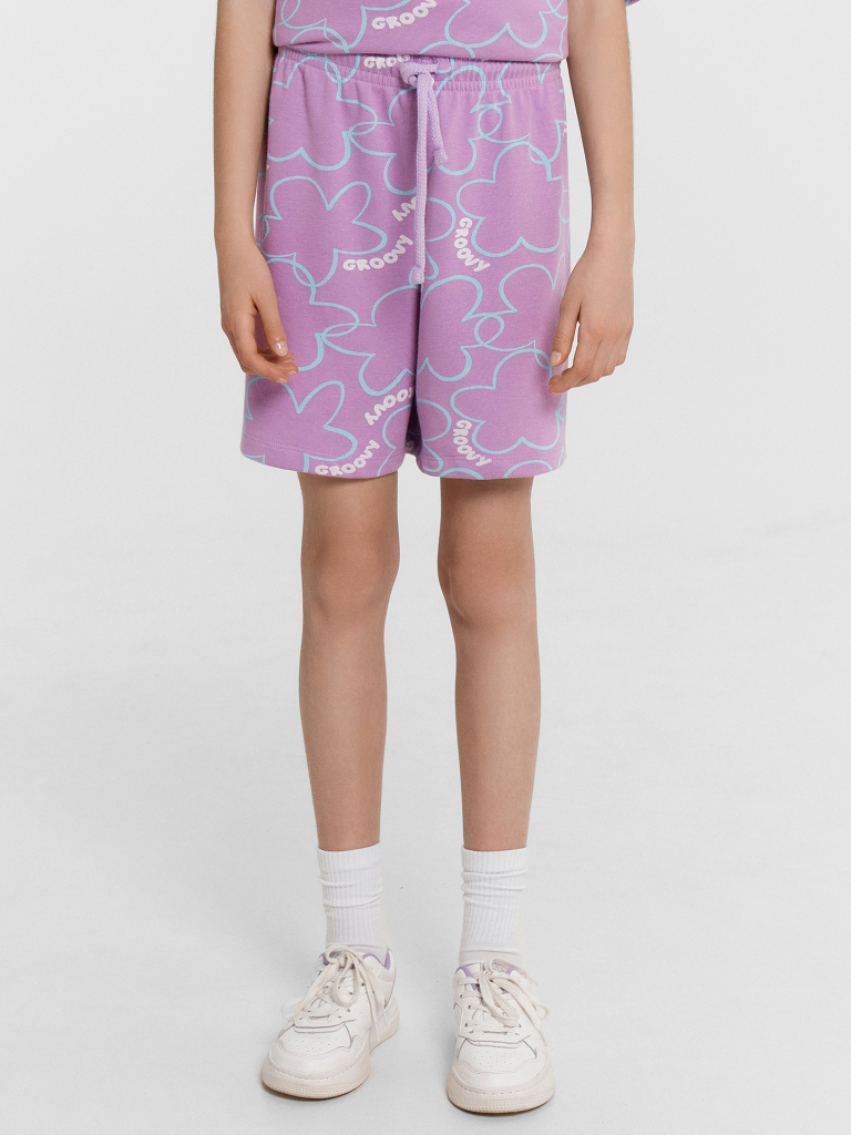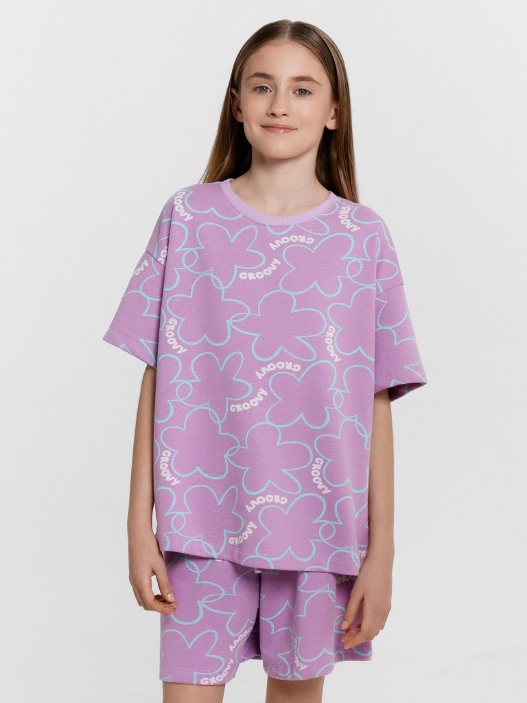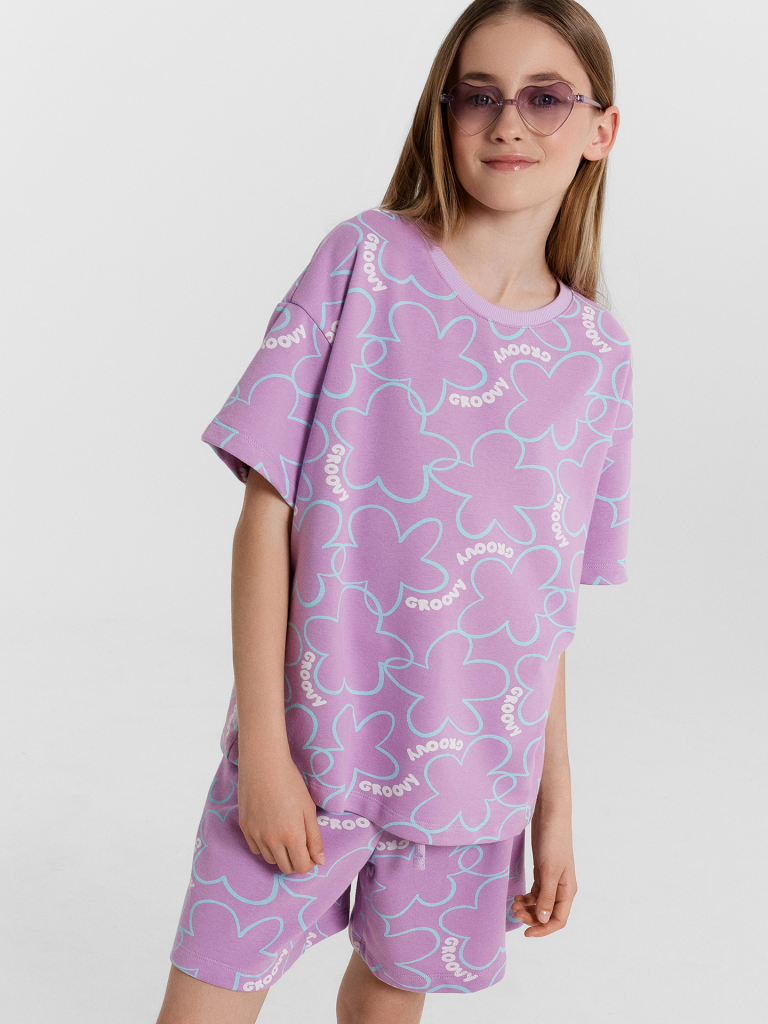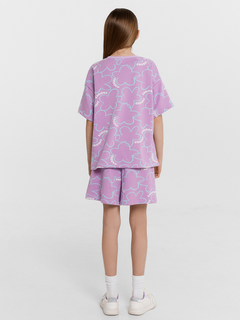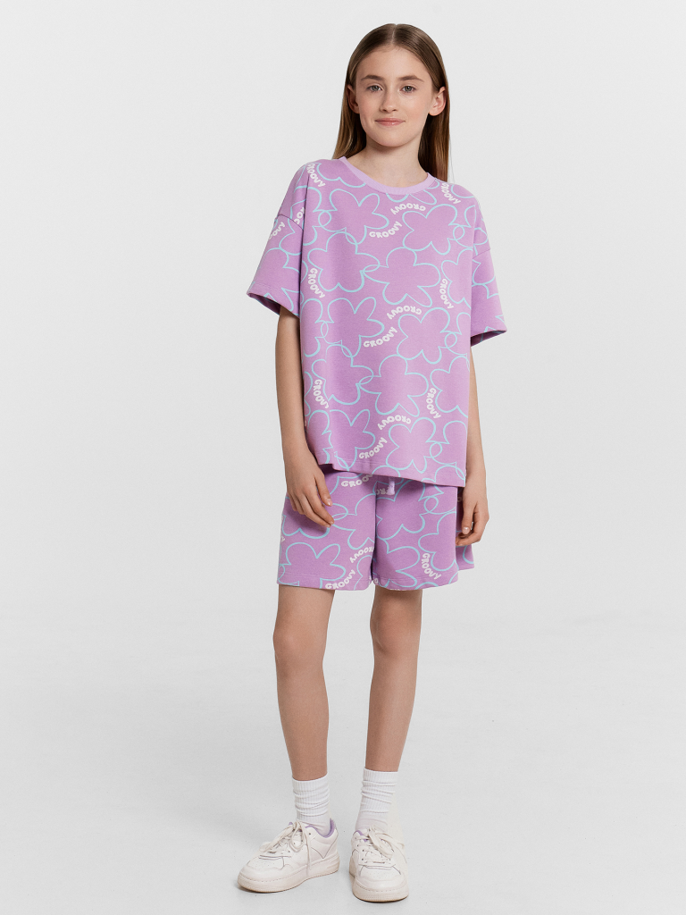 Стильный комплект для девочек. Выполнен из трикотажного футера. Состоит из футболки и шортов. Футболка свободного силуэта длиной до середины бедра, с короткими рукавами и круглой горловиной. Шорты длиной немного выше колен, с эластичной резиной в поясе и регулировочным шнуром. Прекрасный выбор!