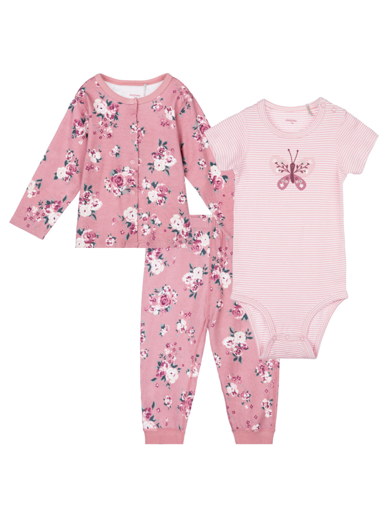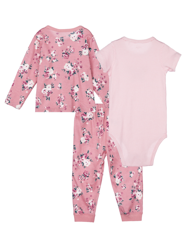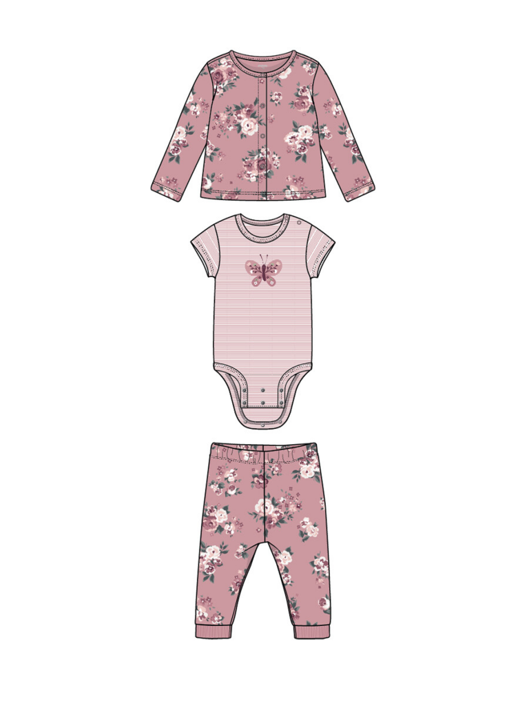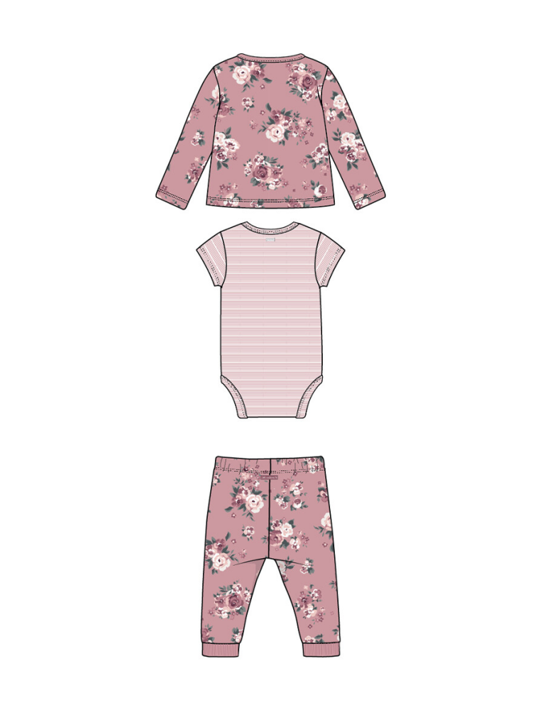 Комплект: боди, кофточка, ползунки из 100% хлопка. Боди имеет 2 ряда кнопок, что позволяет ему расти вместе с малышом. Кофточка с застежкой на кнопки. Штаны на резинке.