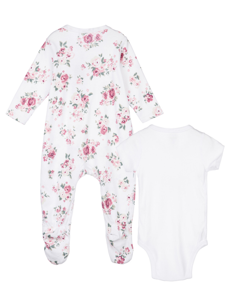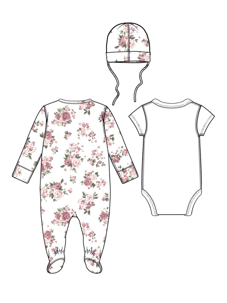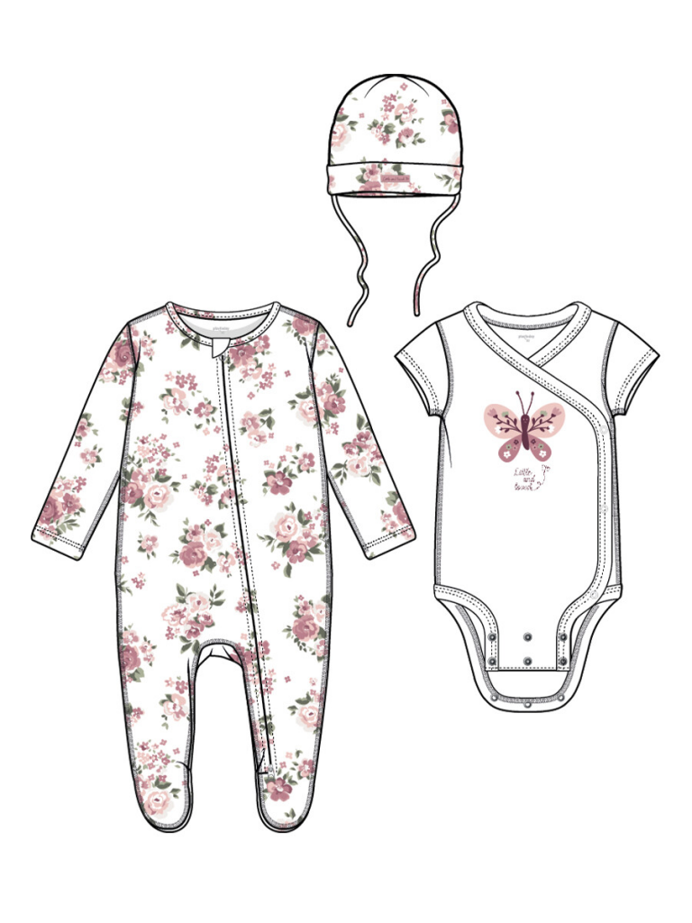 Комплект: боди, комбинезон, шапочка из 100% хлопка. Боди с запахом имеет 2 ряда кнопок, что позволяет ему расти вместе с малышом. Комбинезон с легкой фиксацией резинкой на пятке. Шапочка с завязками.