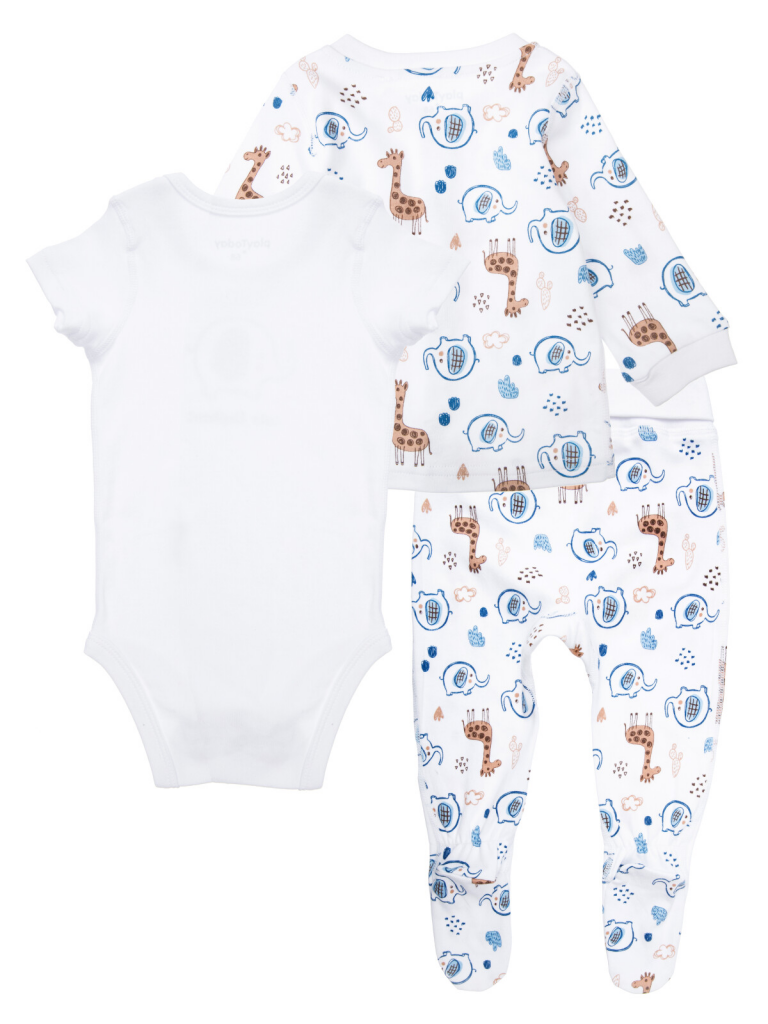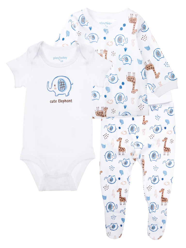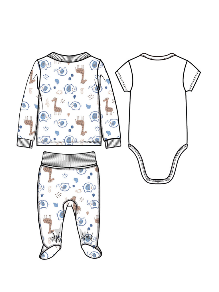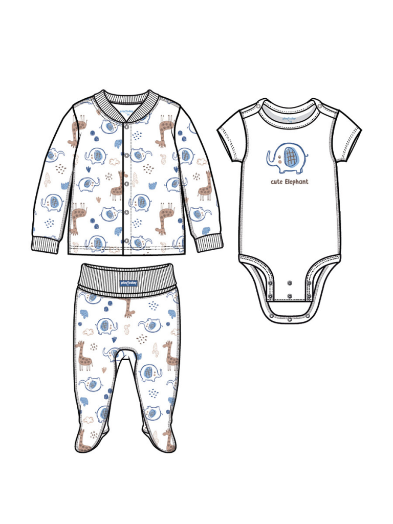 Комплект: боди, кофточка, ползунки. У боди все застежки на кнопки. Кофточка с застежкой на кнопки. На воротнике и манжетах эластичная резинка. Ползунки с мягким двухслойным трикотажным поясом. На пятке легкая фиксация на тонкую резинку.