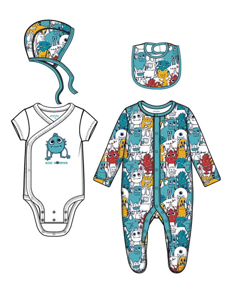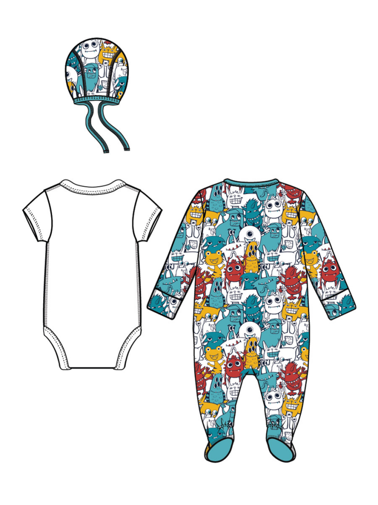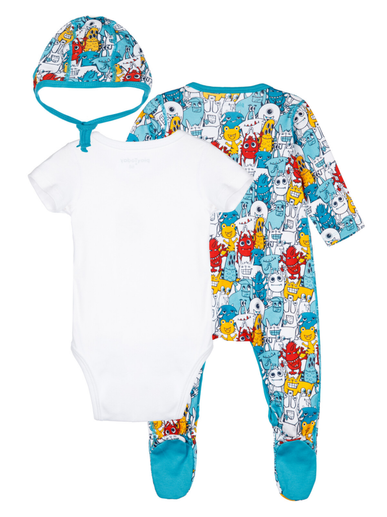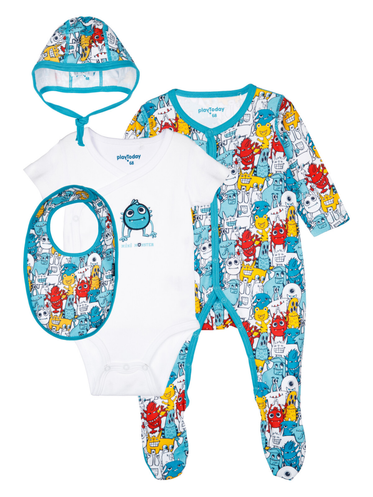 Комплект: комбинезон, боди, чепчик, нагрудник. Комбинезон с застежкой на кнопки. На пятке легкая фиксация на тонкую резинку. Боди имеет застежку на кнопки. Чепчик из трикотажа с завязками. Нагрудник из трикотажа с застежкой на липучку.
