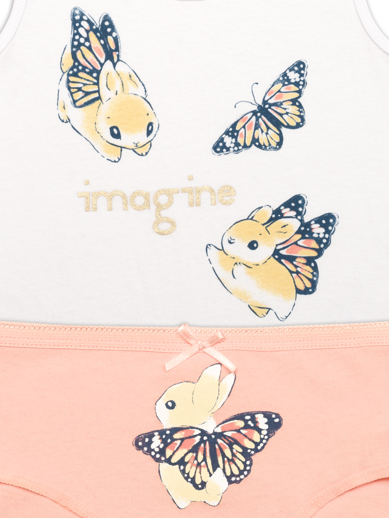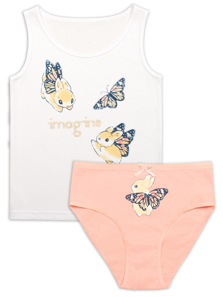 Комплект для девочек майка и трусики. Майка на широких лямках, отделка горловины и пройм пайпингом. Прочный принт, надпись с золотом. Перевод Воображай. Трусики слипы. По талии эластик с фестонным краем, декорирован атласным бантиком, обработка эластиком по ноге. Прочный принт.