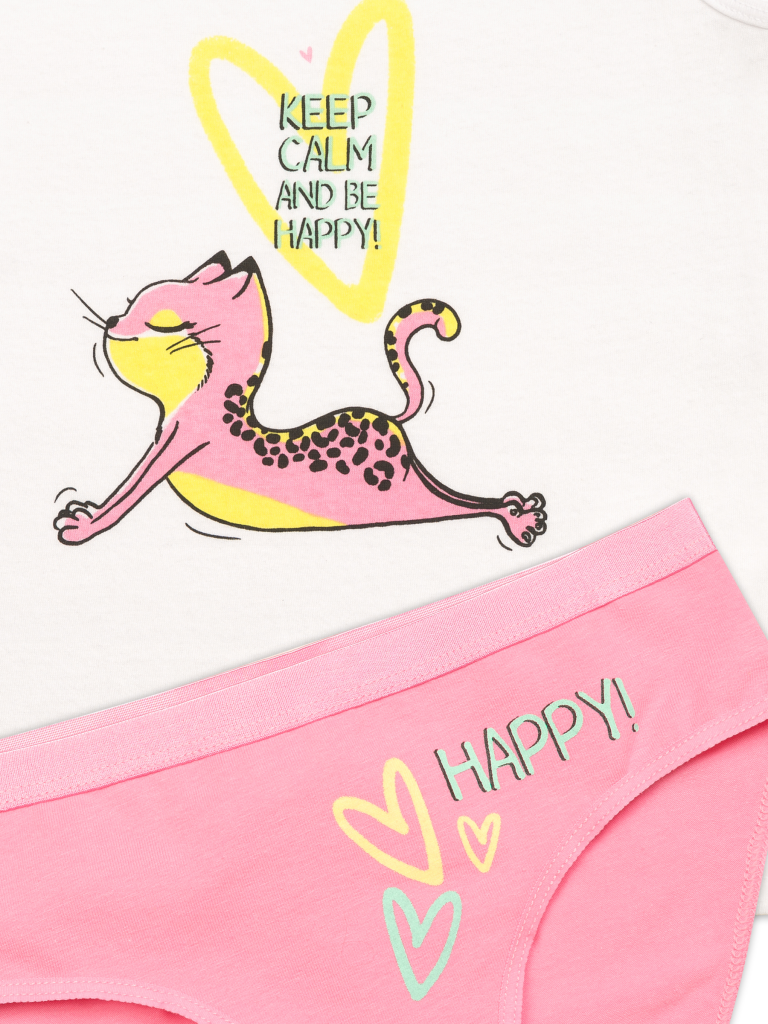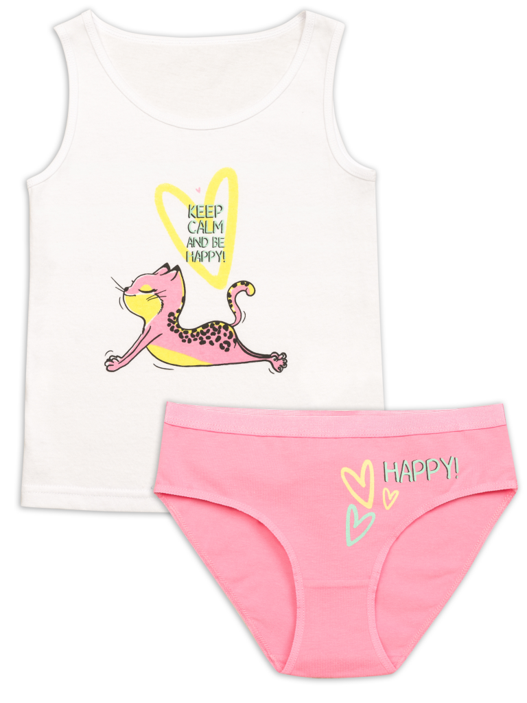 Комплект для девочек майка и трусики. Майка на широких лямках, отделка горловины и пройм пайпингом. Прочный принт Сохраняй спокойствие и будь счастливым. Трусики слипы. По талии эластик с сатиновым блеском, обработка эластиком по ноге. Прочный принт. Перевод Счастье.