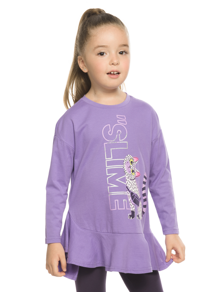 Комплект для девочек туника и лосины. Туника А силуэта с мягким спущенным плечом очень свободного силуэта. Асимметричный низ туники подчеркнут красивым воланом. Фольгированный голографический принт с неоном. Лосины из эластичного трикотажа.