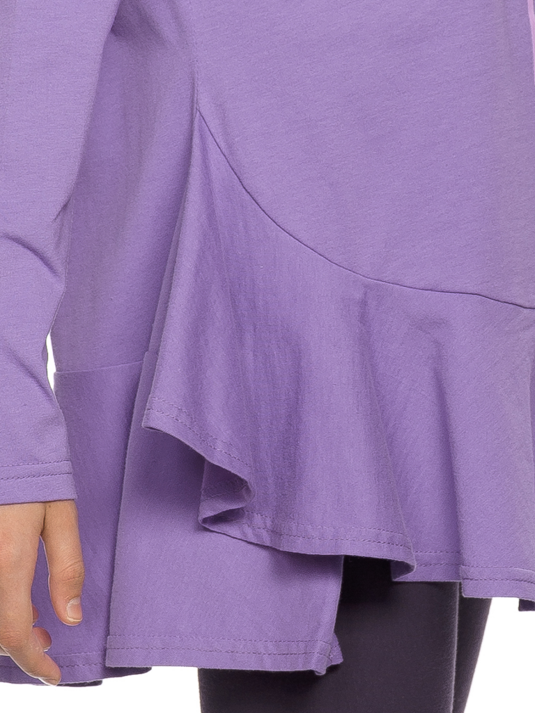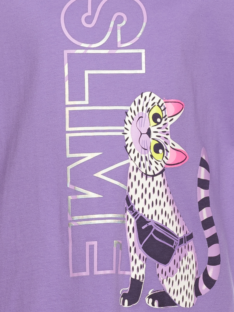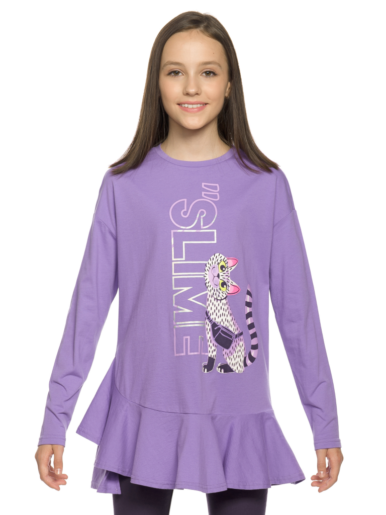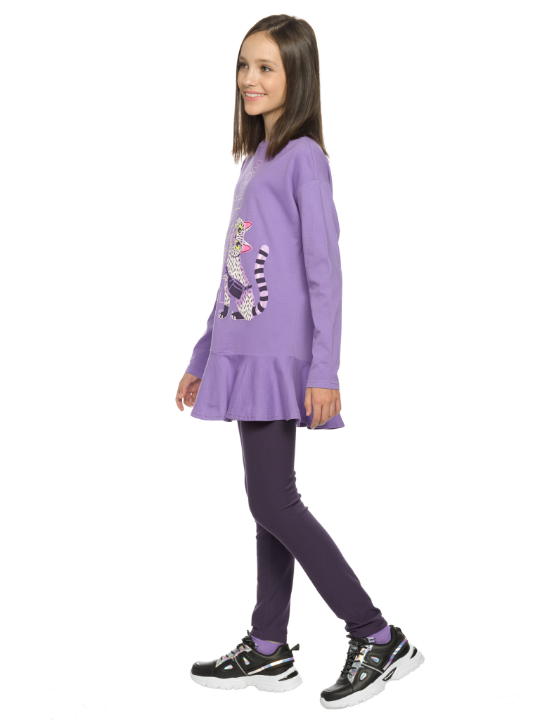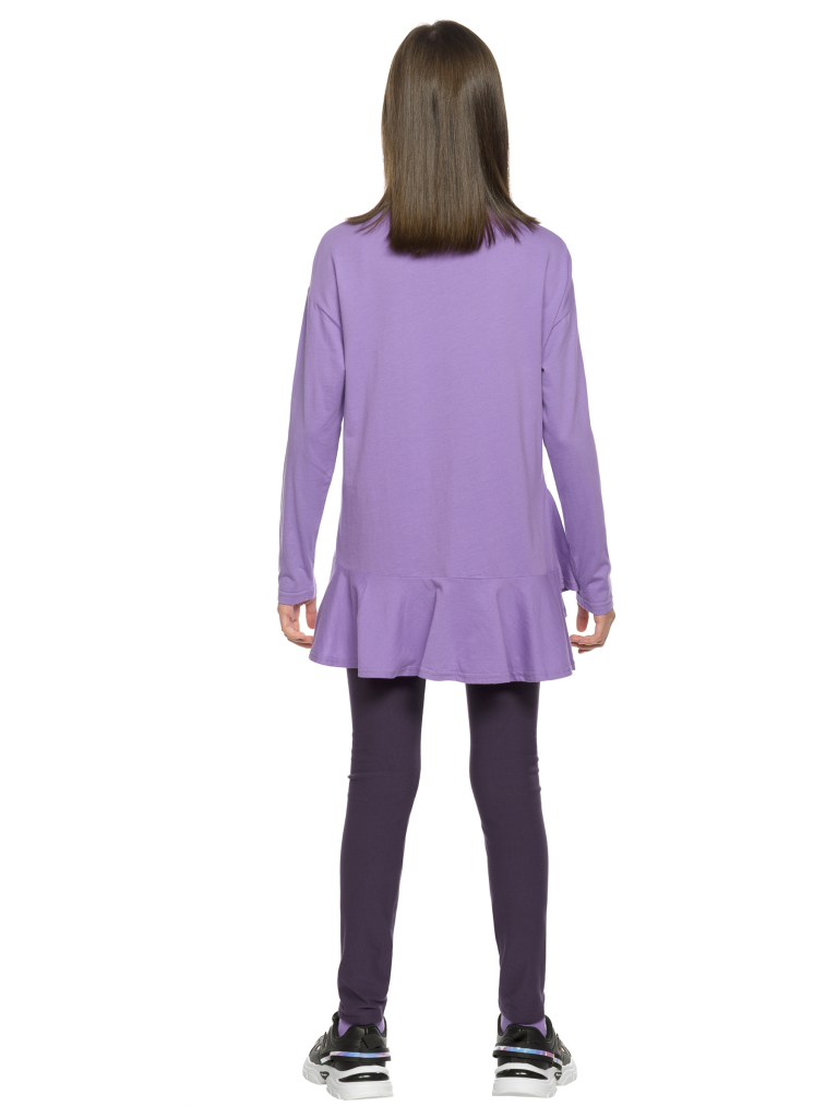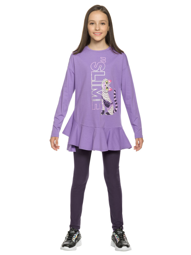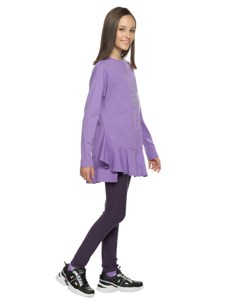 Комплект для девочек туника и лосины. Туника А силуэта с мягким спущенным плечом очень свободного силуэта. Асимметричный низ туники подчеркнут красивым воланом. Фольгированный голографический принт с неоном. Лосины из эластичного трикотажа.