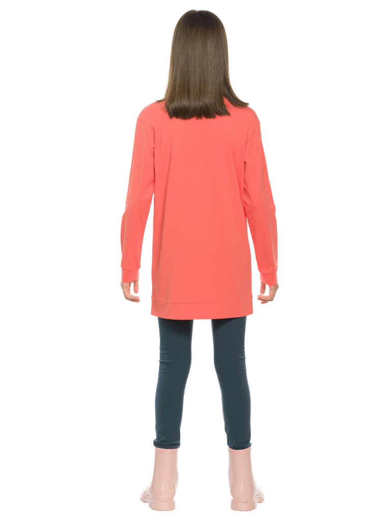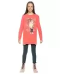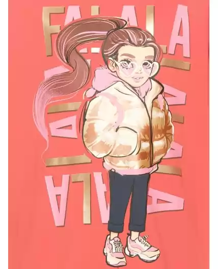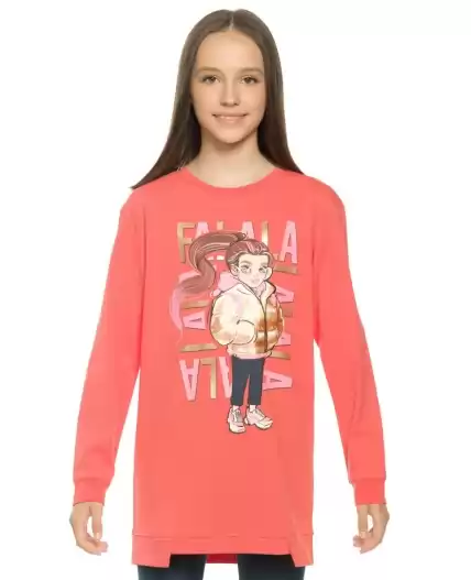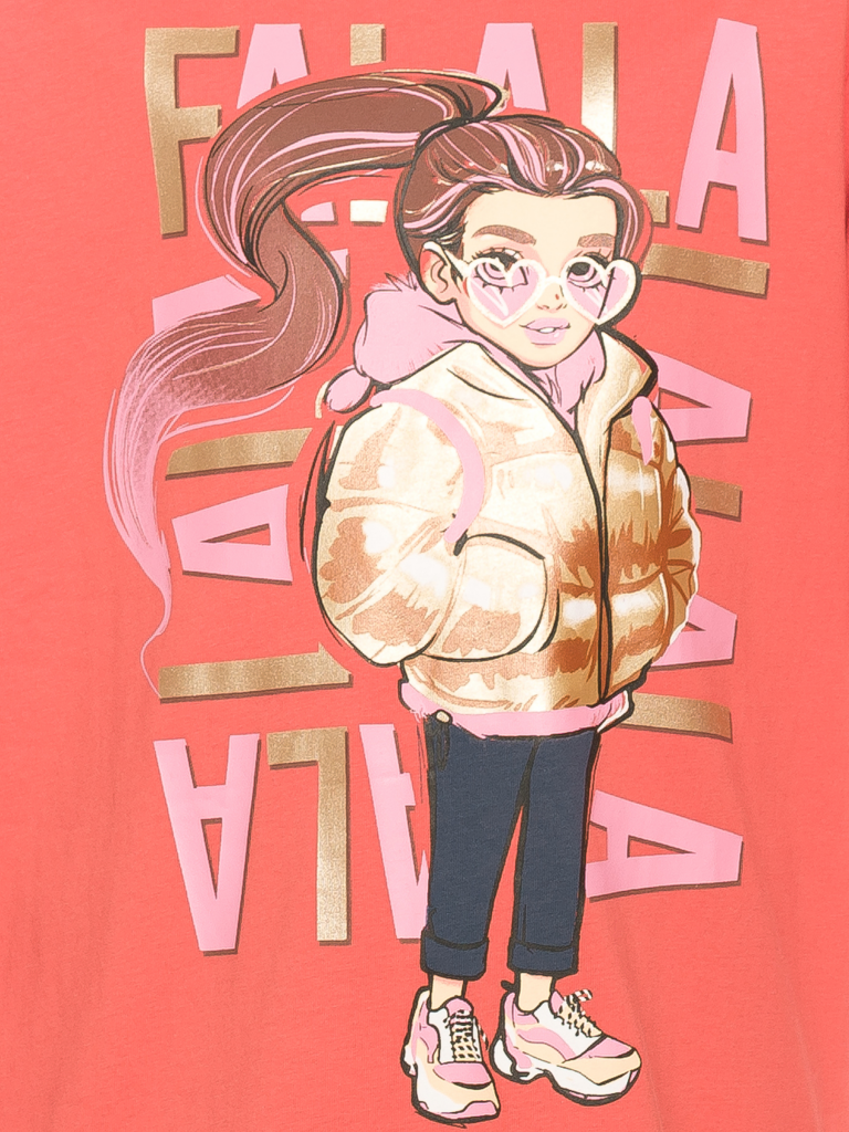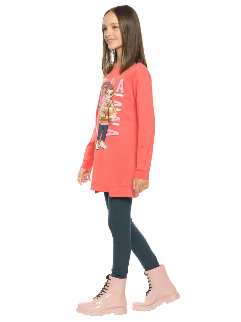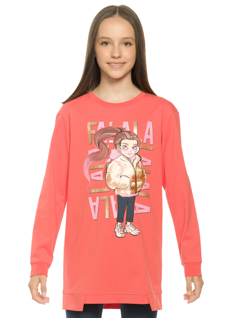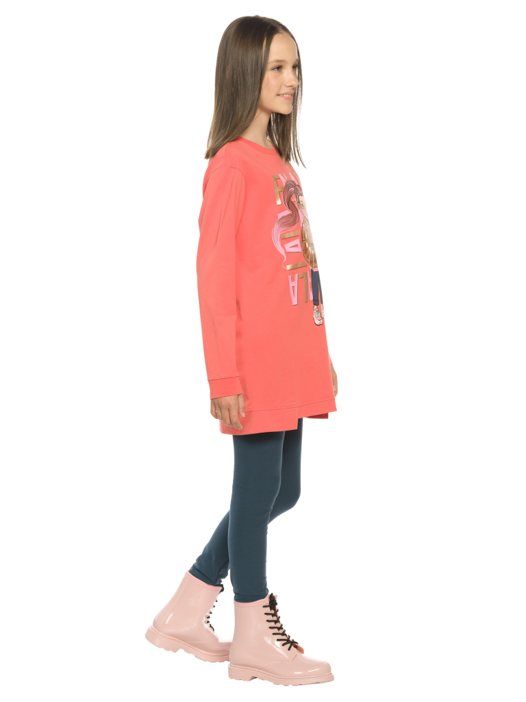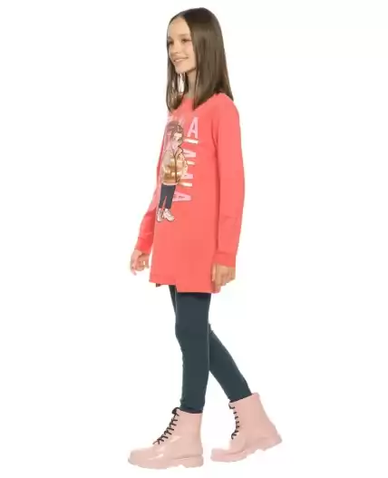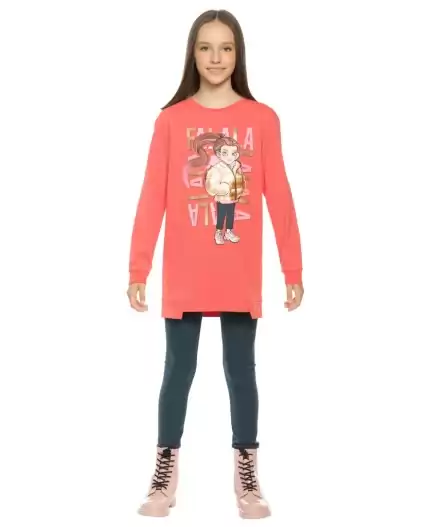 Комплект для девочек туника и лосины. Туника О силуэта со слегка спущенным плечом и манжетами из основной ткани. Низ изделия обработан двумя разноуровневыми манжетами. Принт стилизованный прототип героини истории. Вот она в кроссах, джинсах и металлизированной куртке. Копирайт с золотым металликом ФАЛАЛА. Классические длинные лосины.
