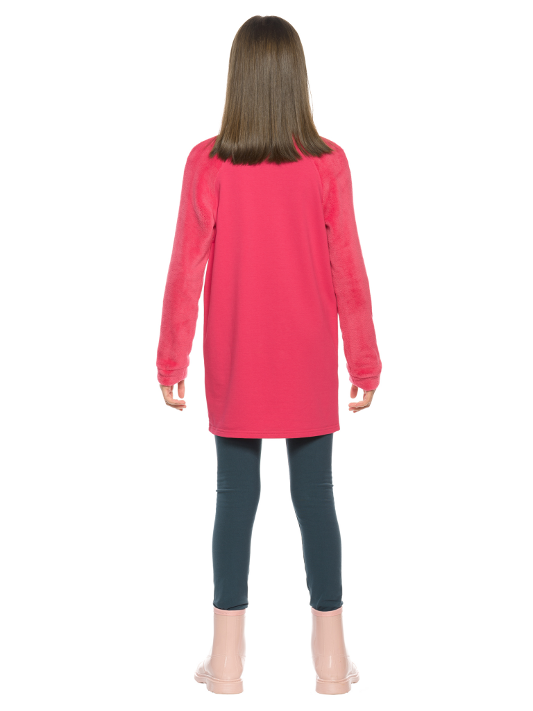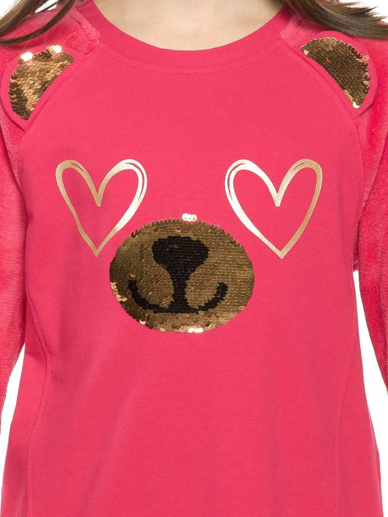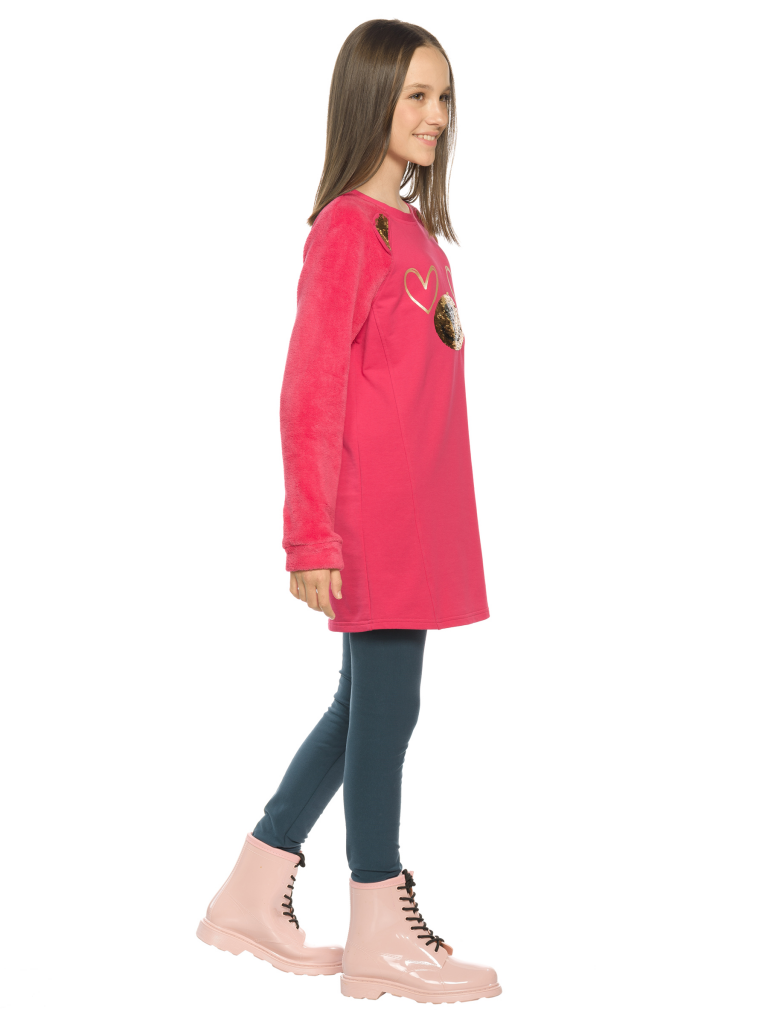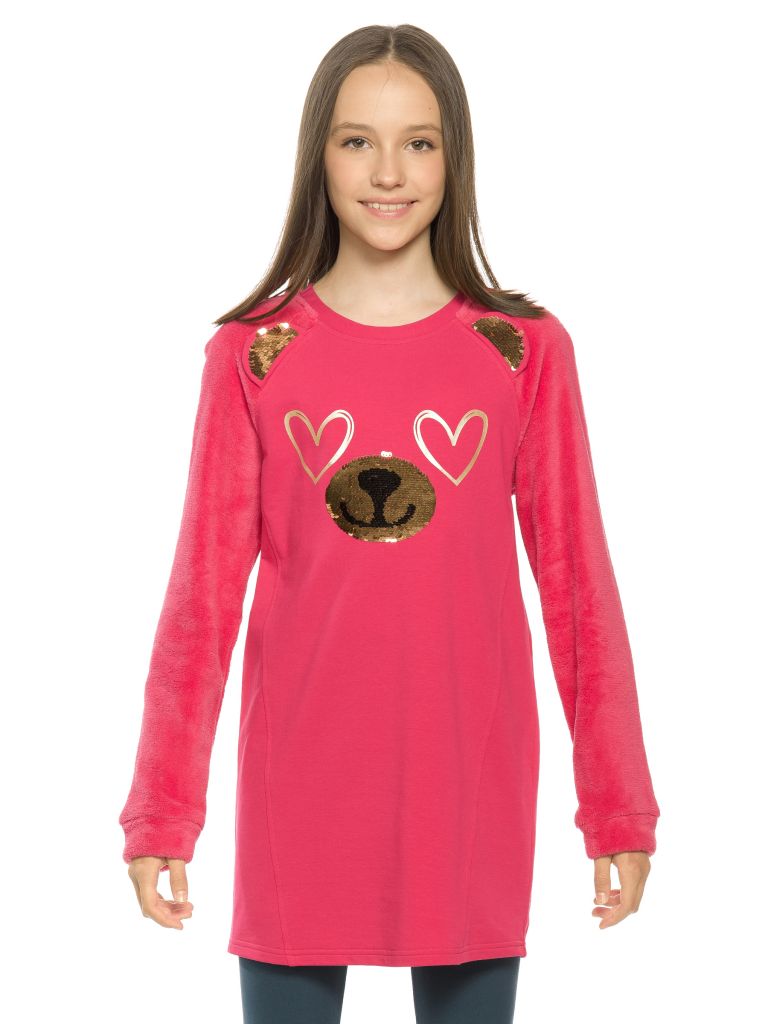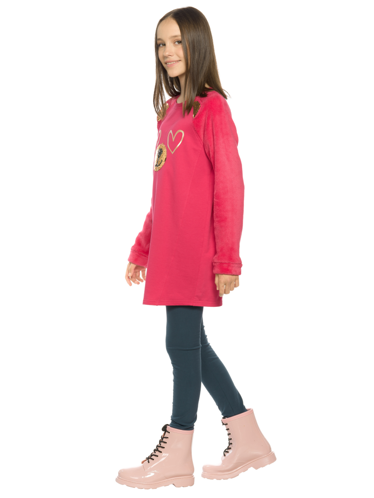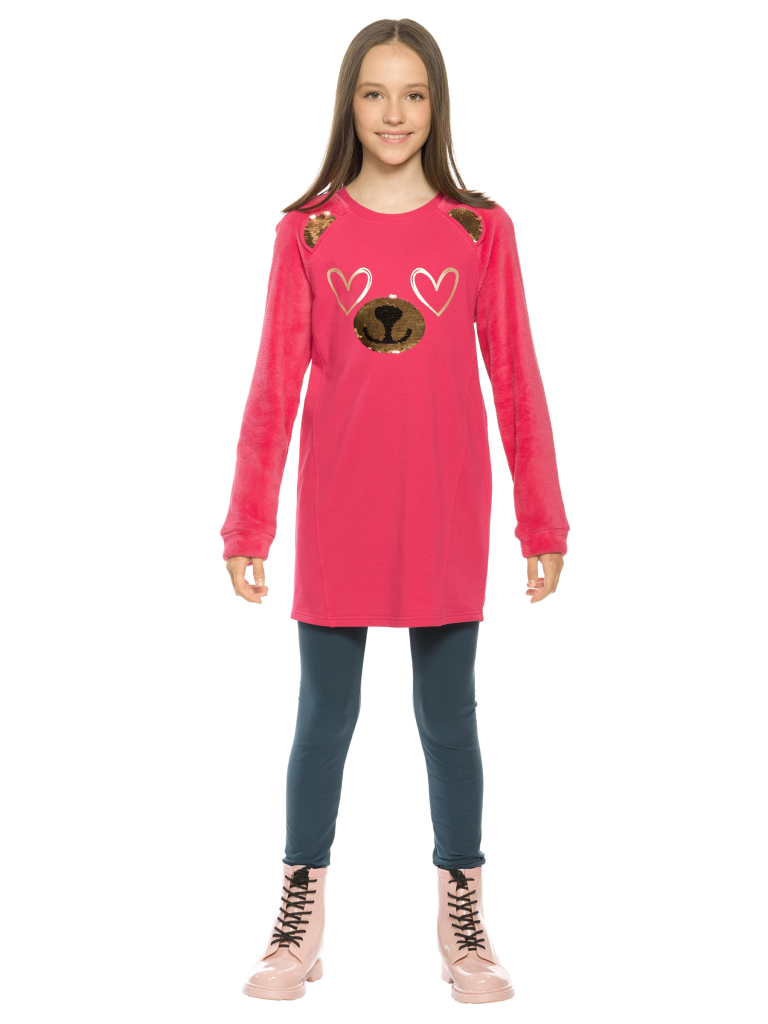 Комплект для девочек туника и лосины. Туника из футера с рукавами реглан из велсофта. На переде рельефные швы, создающие силуэт лёгкий бочонок. В швах рукава вшиты декоративные ушки, расшитые золотистыми пайетками. По переду принт из мягких стойких золотых сердечек и вышивки из пайеток, имитирующие мордочку медведя. Лосины из эластичного футера с начесом.