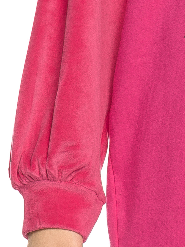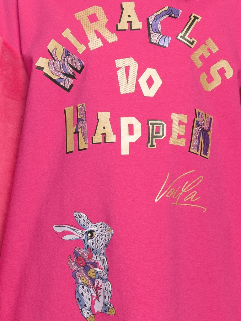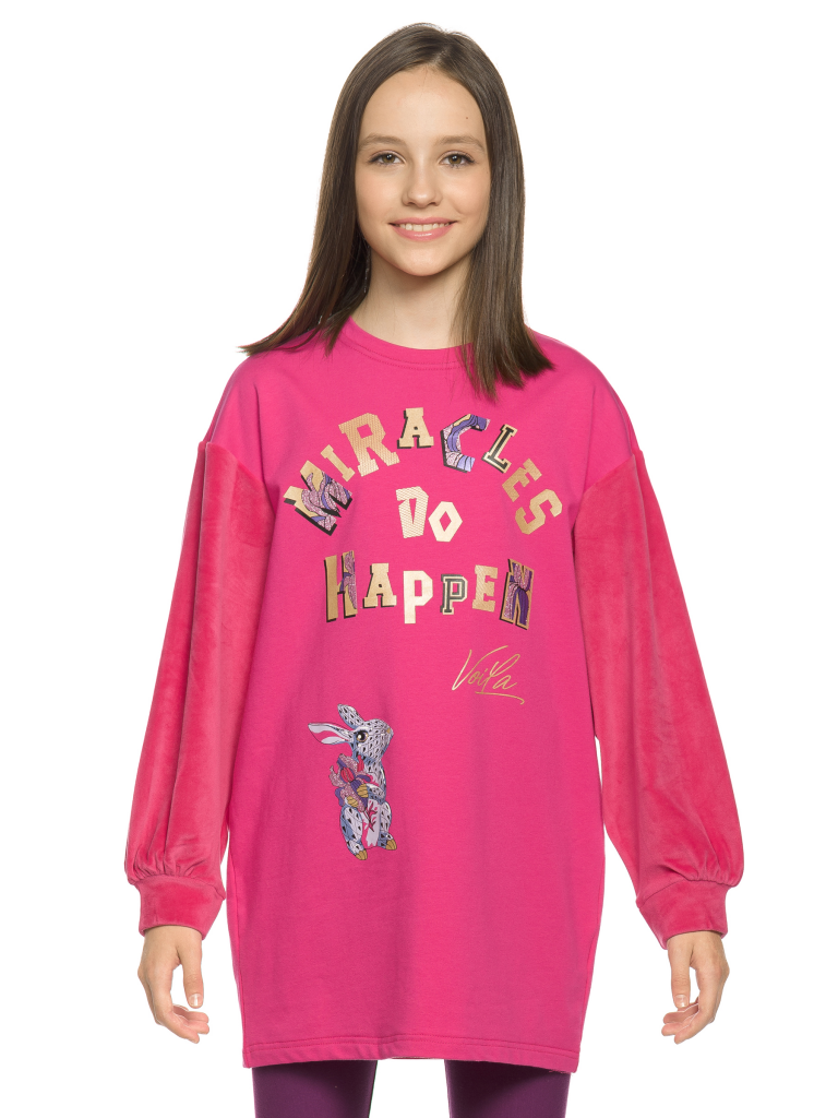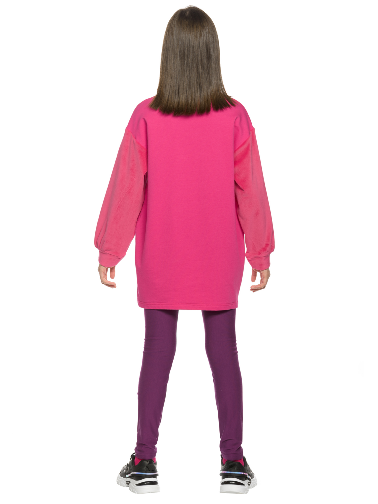 Комплект для девочек туника и лосины. Туника мягкого оверсайз силуэта со спущенной линией плеча. Перед и спинка из футера, рукава из мягкого плюшевого велюра с перламутровым отблеском. Эластичный rubber принт с золотым металликом и глиттером. Надпись Чудеса случаются. Вуаля. Низ Классические лосины из футера с начесом.