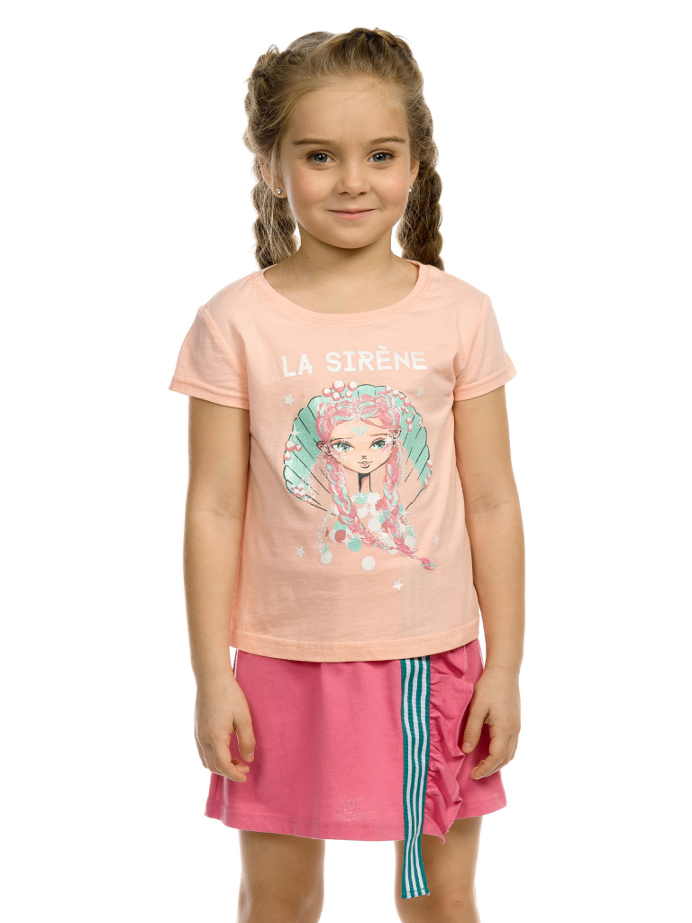 Комплект для девочек: футболка, юбка. Футболка умеренного объема, комфортной длины. Мягкий стойкий и эластичный принт с блестками. Юбка - новинка! Имитация запаха, по левой половине переда - рюша и вертикально настроченная полосатая репсовая лента шириной 4 см. Лента длиннее края изделия на 5 см. Мягкий пояс с широкой внутренней резинкой.