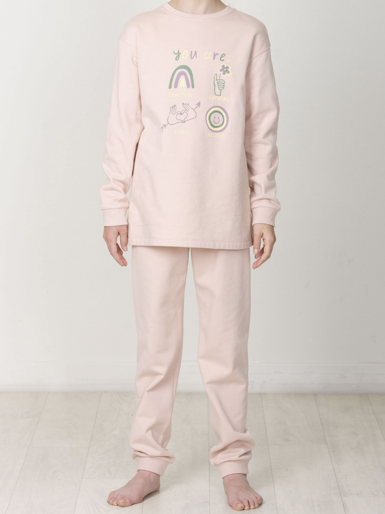 Комплект для девочки и футера с начесом - джемпер и брюки. Комплект из 100% хлопка. Джемпер и брюки на манжете - удобно, можно брать на вырост и без примерки. Удобная, мягкая, дышащая одежда для дома. Комфортно спать и играть. Используя пижаму как одежду для сна, можно не беспокоится, что ребенок не укрывается.