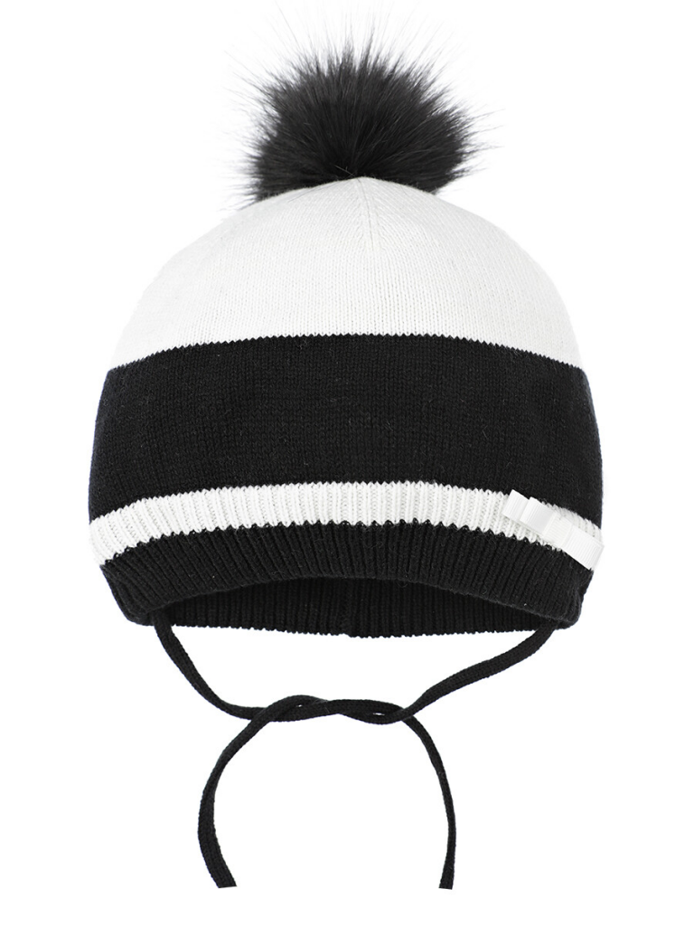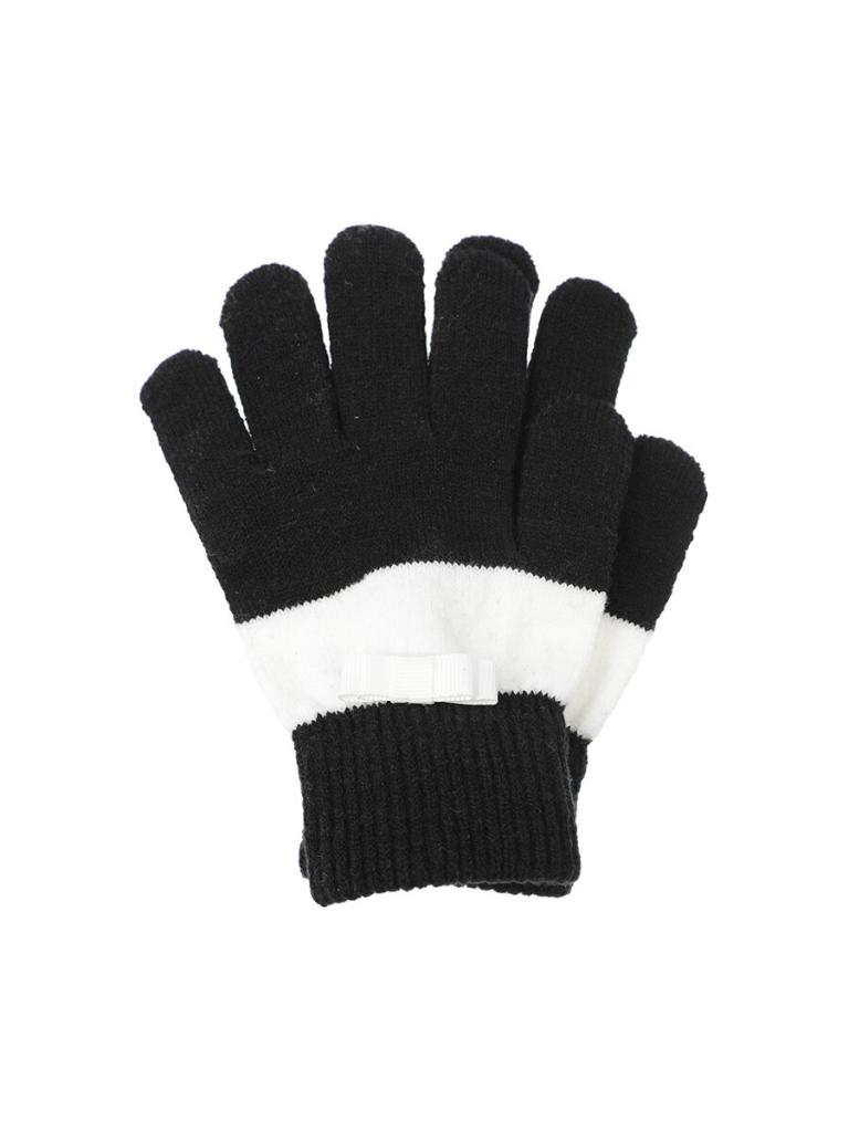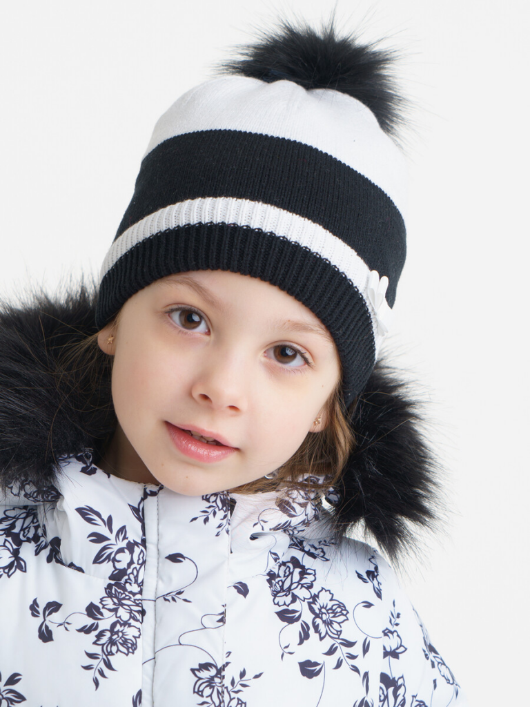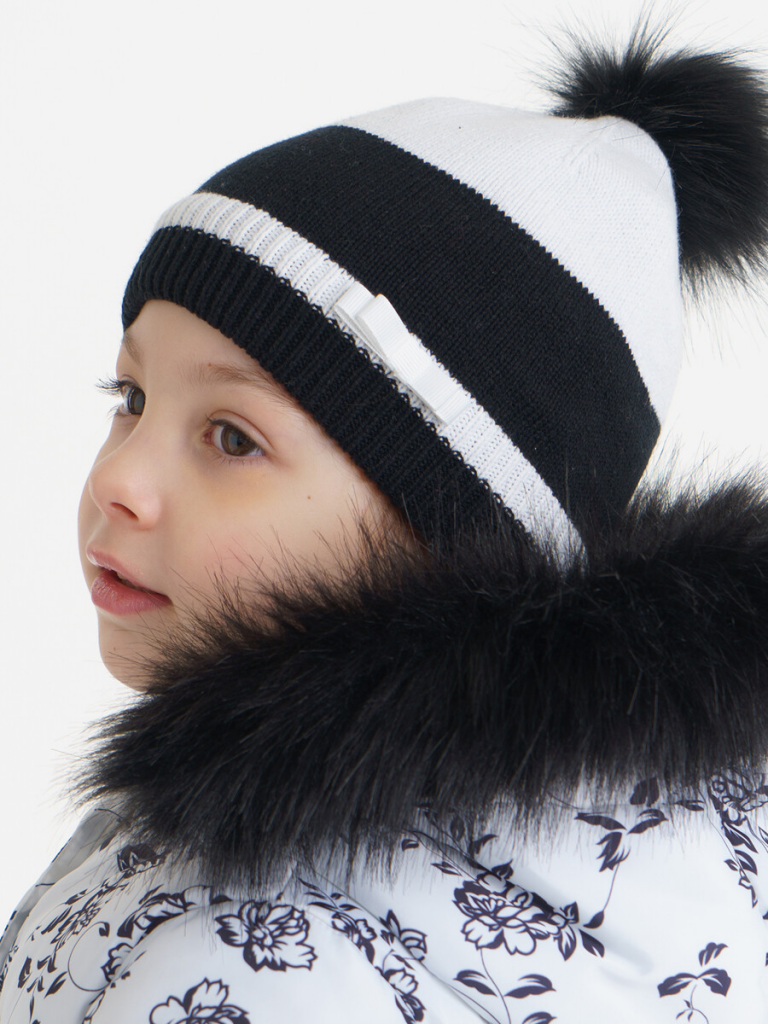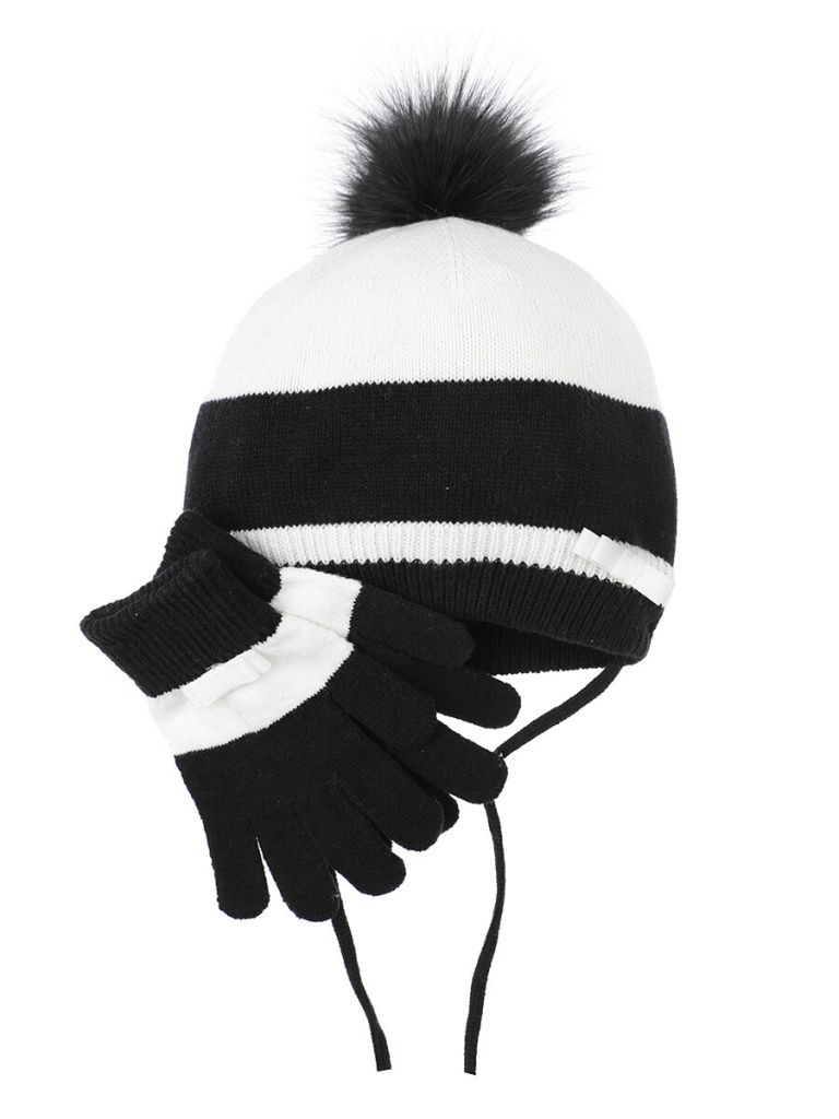 Шапка из вязаного трикотажа, перчатки. Эластичная резинка по краю. Утеплена флисом. Модель украшает помпон из искусственного меха и бант. Высокое содержание хлопка в составе нити.