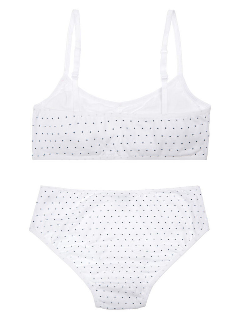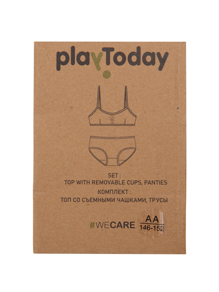 Комплект белья: топ, трусы. Топ со съемными чашками и регулируемыми бретелями. Трусы-слипы. Высокое содержание хлопка 93%. Благодаря наличию эластана в составе ткани изделие проще в уходе и держит форму.
