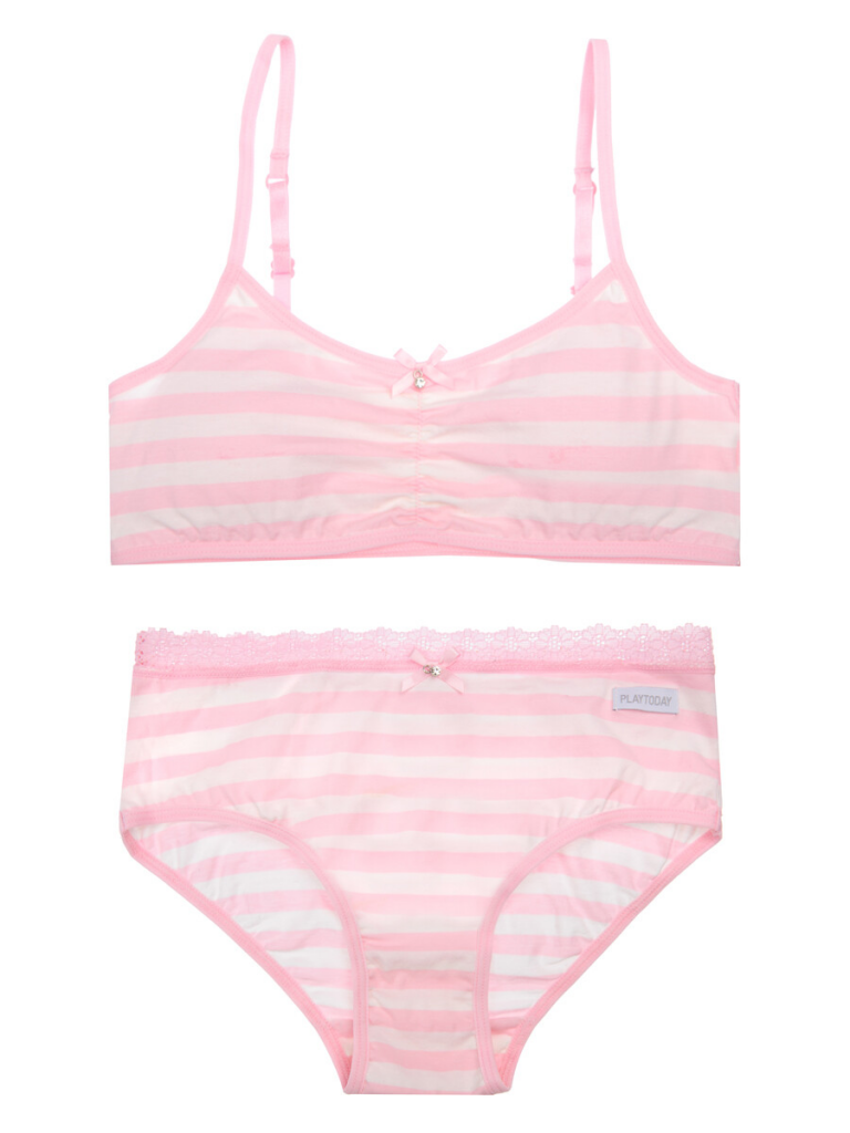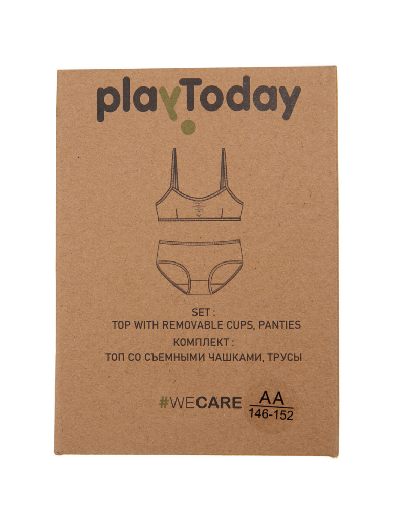 Комплект белья: топ, трусы. Топ со съемными чашками и регулируемыми бретелями. Трусы-слипы, по талии эластичное кружево. Высокое содержание хлопка 93%. Благодаря наличию эластана в составе ткани изделие проще в уходе и держит форму.