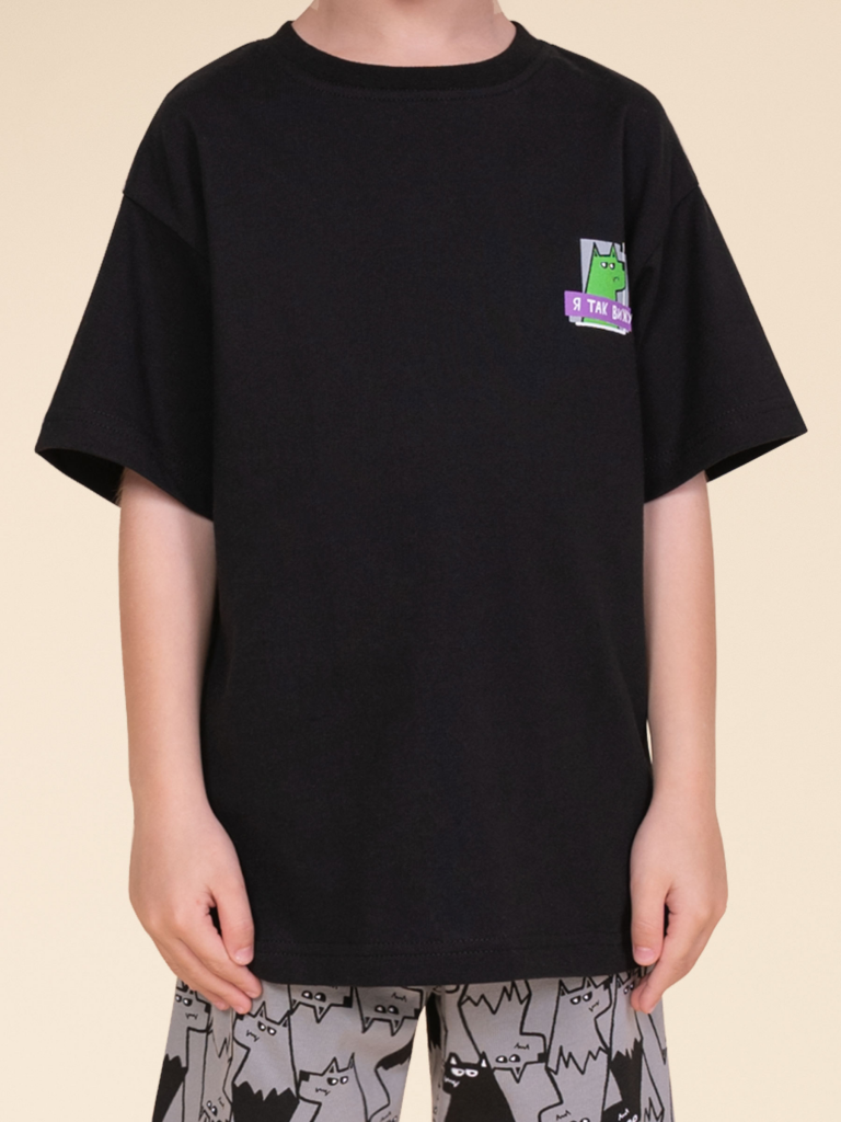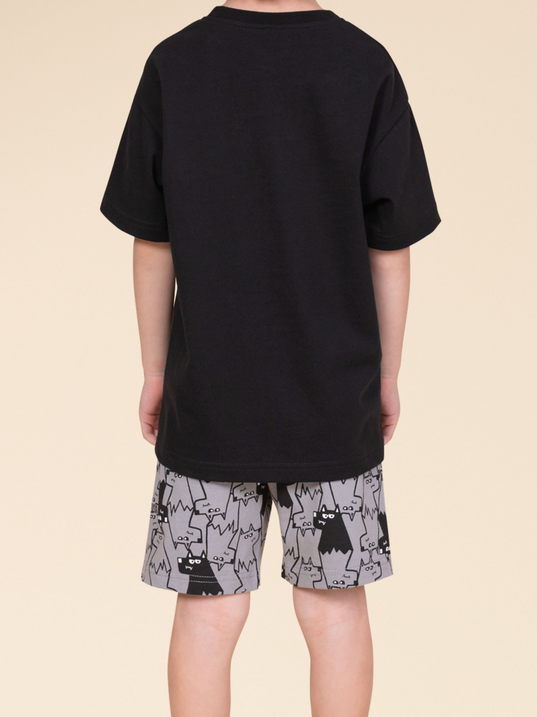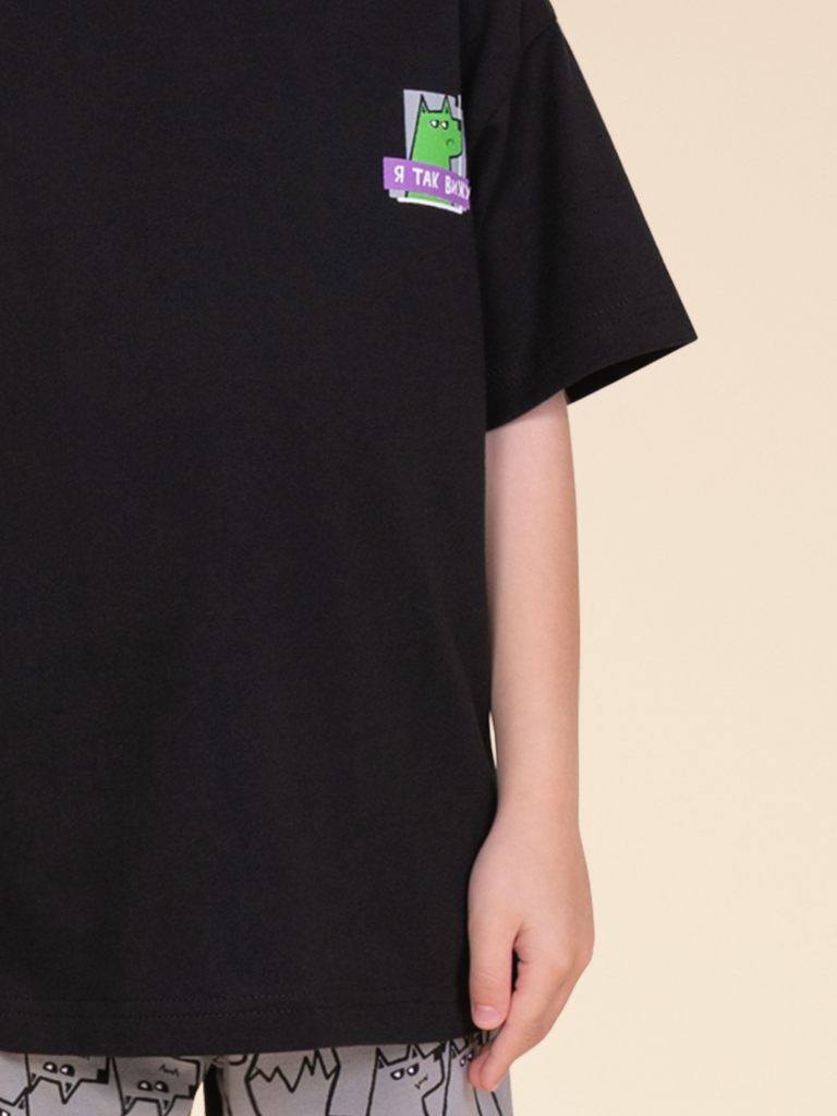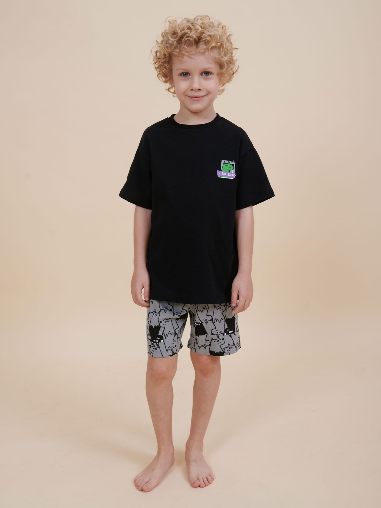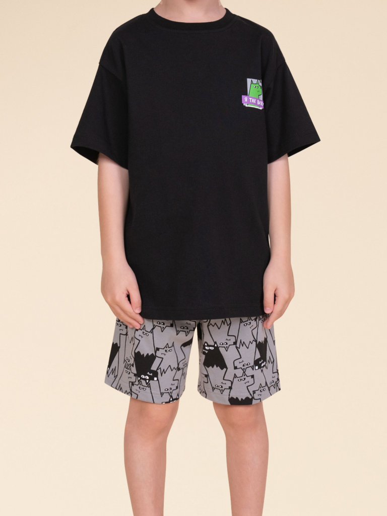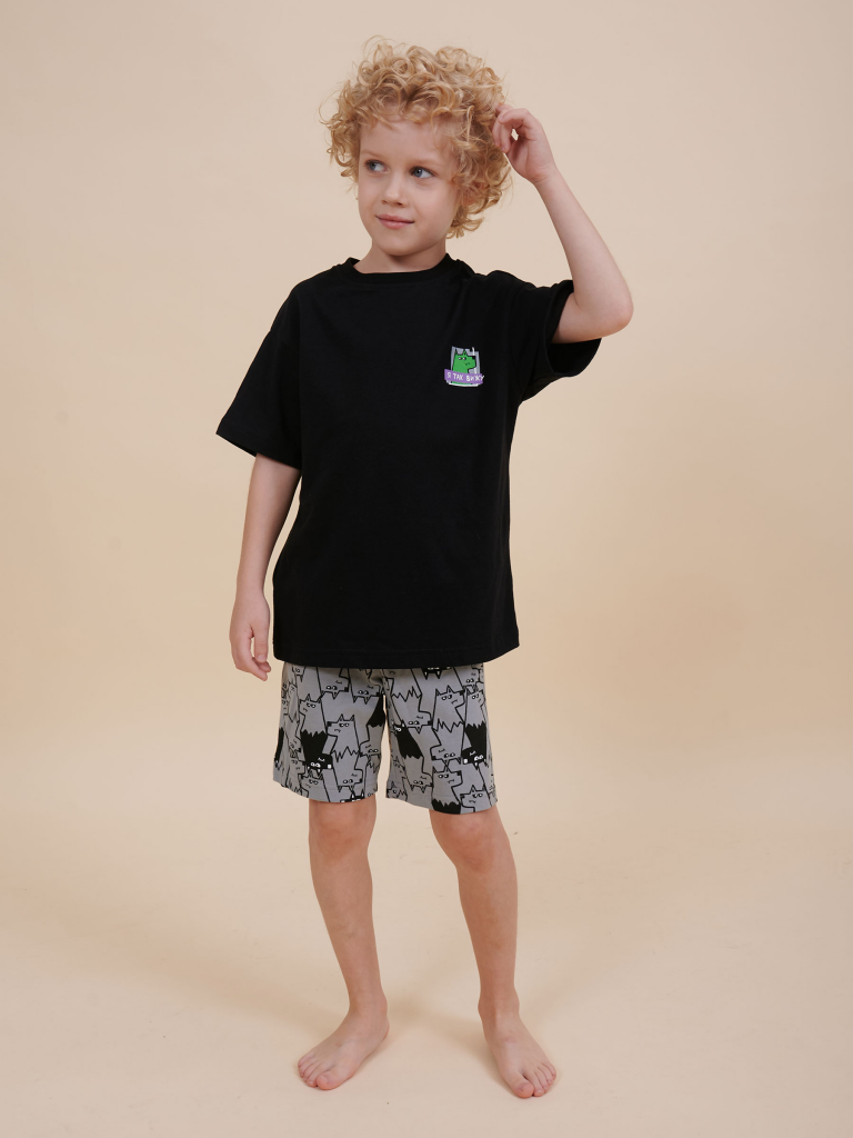 Стильная и уютная пижама для мальчика. В составе ткани 100% хлопка — идеально для детской одежды! Модель приятна на ощупь, прекрасно пропускает воздух, позволяя коже ребёнка дышать. При этом в пижаме из хлопка ребёнку будет уютно, даже если он сбросит одеяло. Всё это обеспечивает комфортный и качественный сон. Футболка и удлинённые шорты, плечо спущено, рукава широкие и свободные — пижама на мальчика очень удобна для сна. Широкая и мягкая резинка в поясе не перекручивается и не давит. Отделка горловины из эластичной рибаны — она не растягивается, ребёнку удобно надевать и снимать пижаму. Шорты декорированы сплошным принтом с забавными собаками, будто нарисованными от руки. Футболку чёрного цвета украшает забавный принт в виде зелёной собаки и надписи "я так вижу". В линейке представлены следующие размеры: 2 (92): 3 (98): 4 (104): 5 (110): 6 (116), 7 (122): 8 (128): 9 (134): 10 (140): 11 (146). Хлопковый комплект идеален для сна и отдыха дома — прекрасный выбор для вашего ребёнка! Пижама с шортами для мальчика подходит для круглогодичного использования. Домашний комплект — замечательный подарок сыну, внуку, брату на любой праздник. Выбирайте нужный размер по таблице размеров на фото. Цвет товара на экране вашего устройства может отличаться от цвета изделия вживую.
