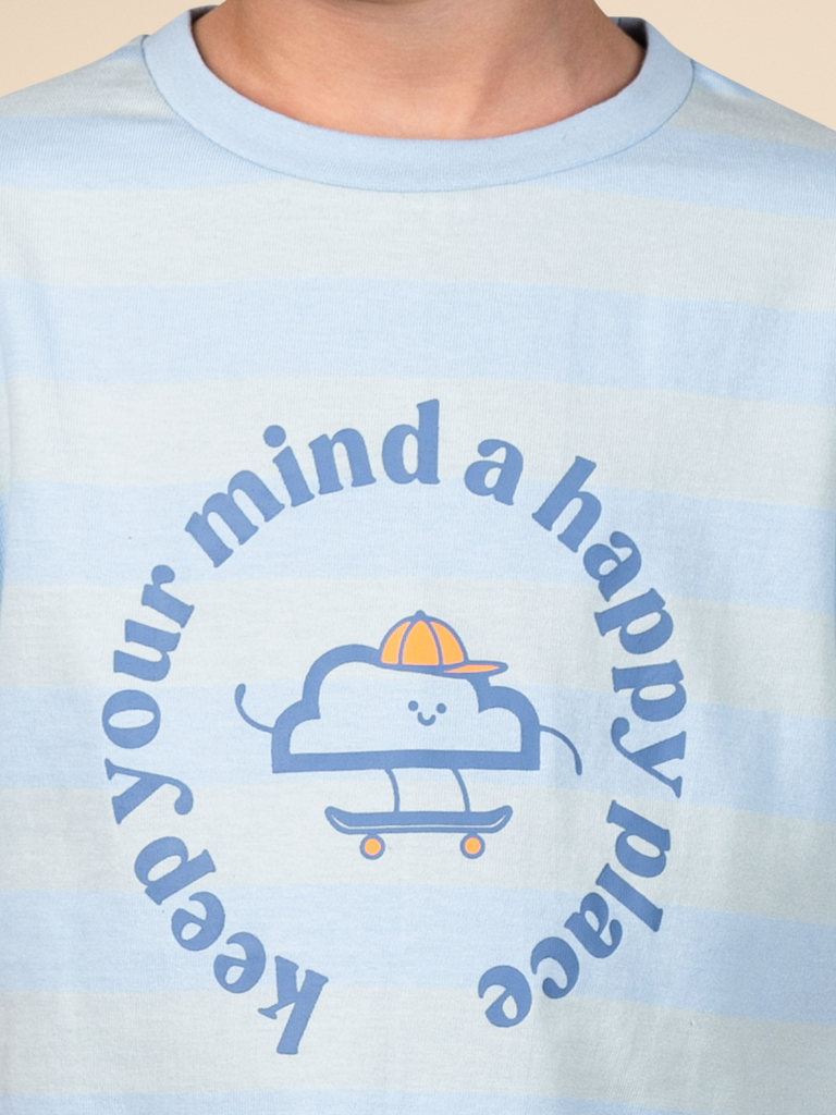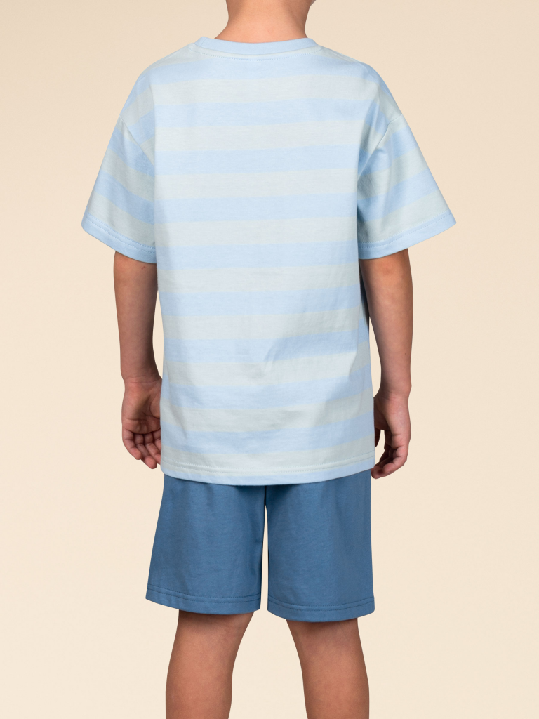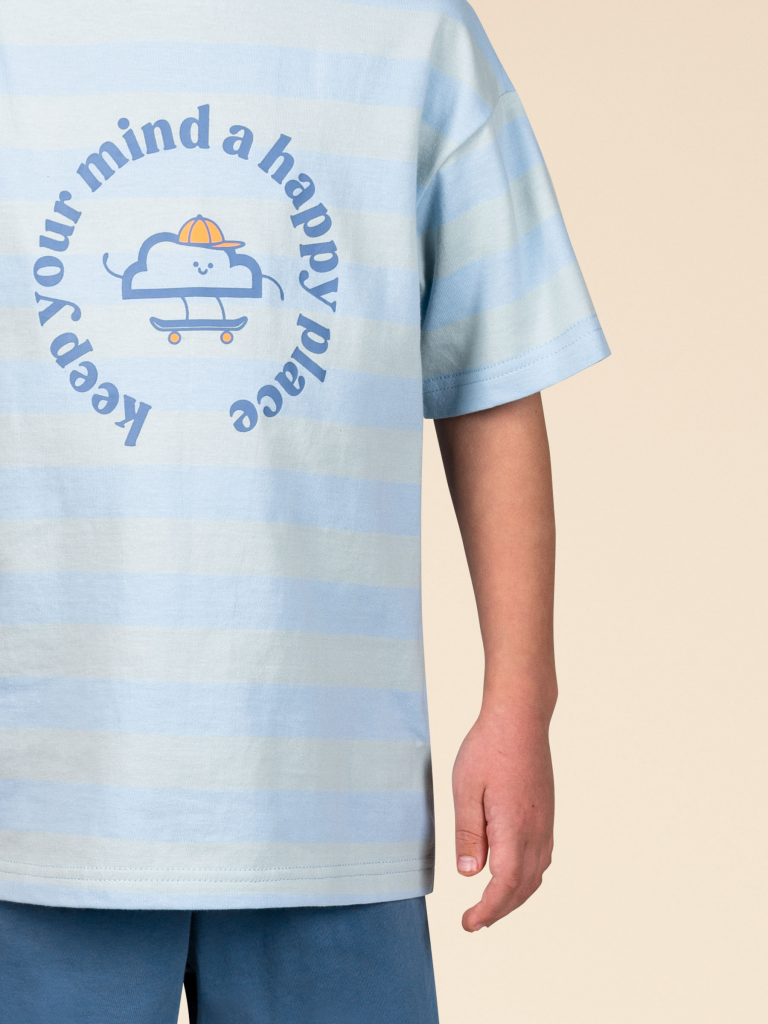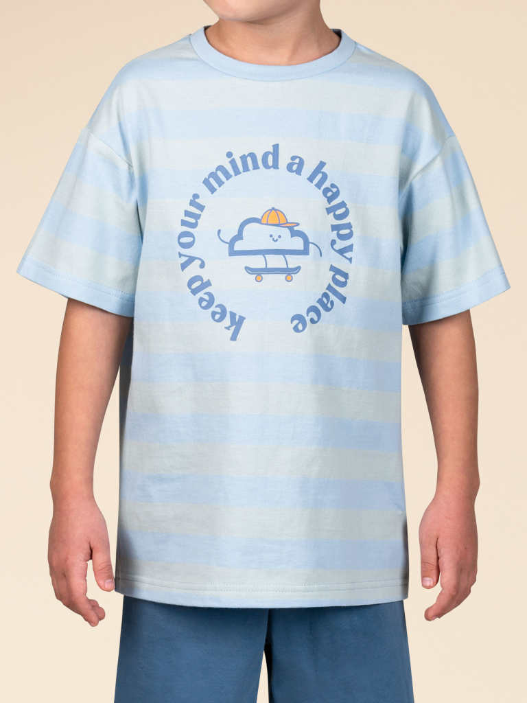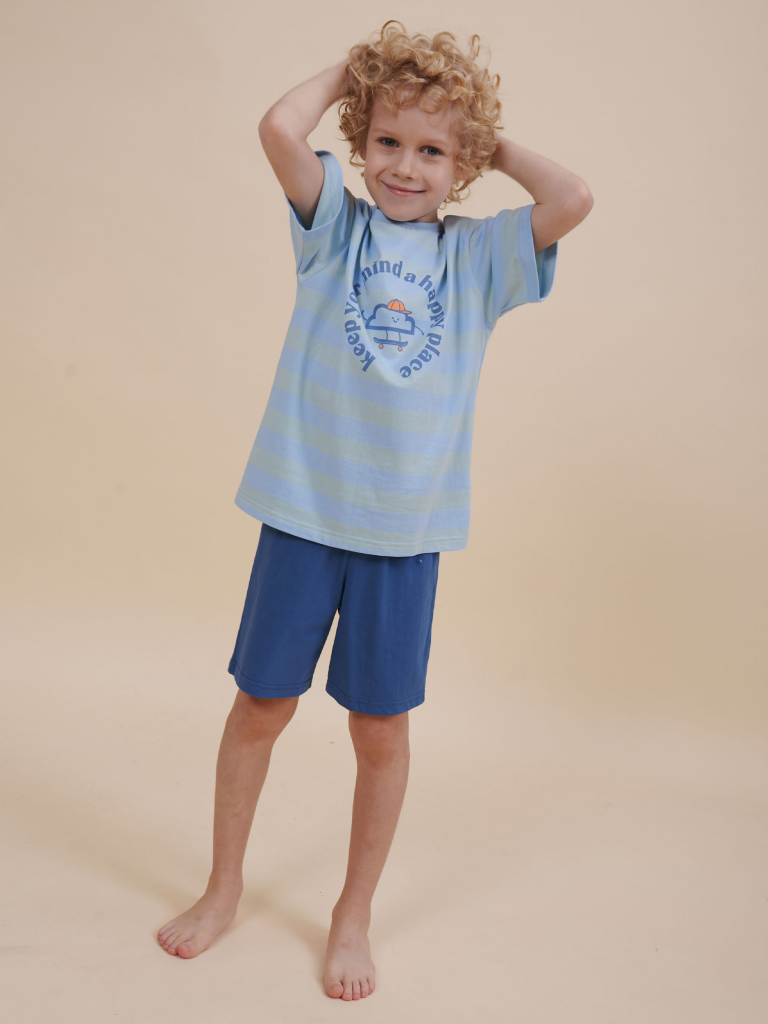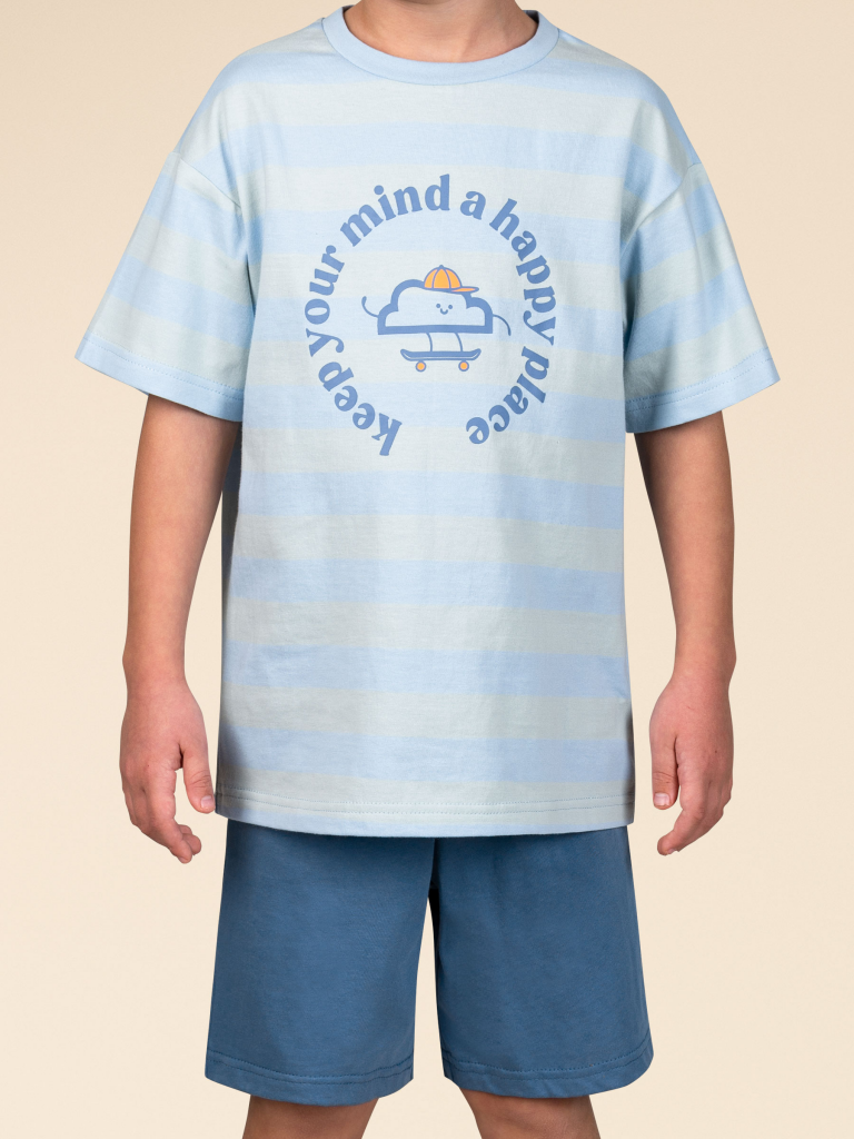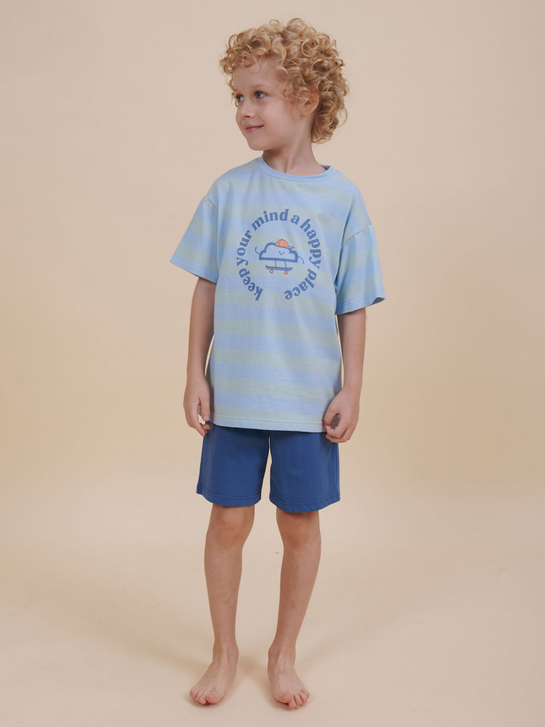 Стильная и уютная пижама в скейтерском стиле для мальчика. В составе ткани 100% хлопка — идеально для детской одежды! Модель приятна на ощупь, прекрасно пропускает воздух, позволяя коже ребёнка дышать. При этом в пижаме из хлопка ребёнку будет уютно, даже если он сбросит одеяло. Всё это обеспечивает комфортный и качественный сон. Футболка и удлинённые шорты, плечо немного спущено, рукава широкие и свободные — пижама на мальчика очень удобна для сна. Широкая и мягкая резинка в поясе не перекручивается и не давит. Отделка горловины из эластичной рибаны — она не растягивается, ребёнку удобно надевать и снимать пижаму. Шорты однотонные, голубого цвета. Футболку в полоску украшает позитивный принт в виде облачка в бейсболке на скейтборде. Надпись переводится: "держи свой разум в счастливом месте". В линейке представлены следующие размеры: 1 (86): 2 (92): 3 (98): 4 (104): 5 (110): 6 (116), 7 (122): 8 (128): 9 (134): 10 (140): 11 (146). Хлопковый комплект идеален для сна и отдыха дома — прекрасный выбор для вашего ребёнка! Пижама с шортами для мальчика подходит для круглогодичного использования. Домашний комплект — замечательный подарок сыну, внуку, брату на любой праздник. Выбирайте нужный размер по таблице размеров на фото. Цвет товара на экране вашего устройства может отличаться от цвета изделия вживую.