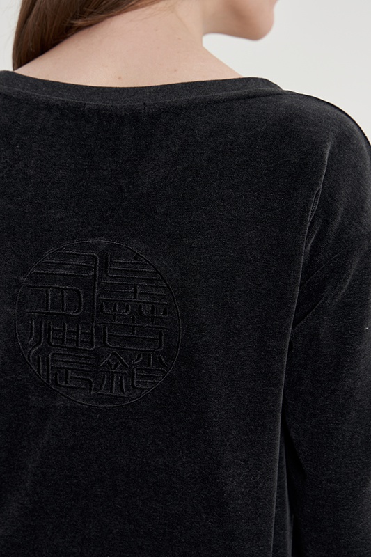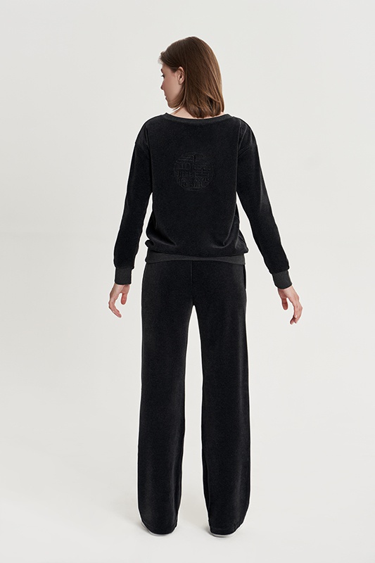 Джемпер свободного кроя с поясом и манжетами, круглый вырез. Декор вышивка на спинке. Брюки расклешенные к низу, карманы в боковых швах