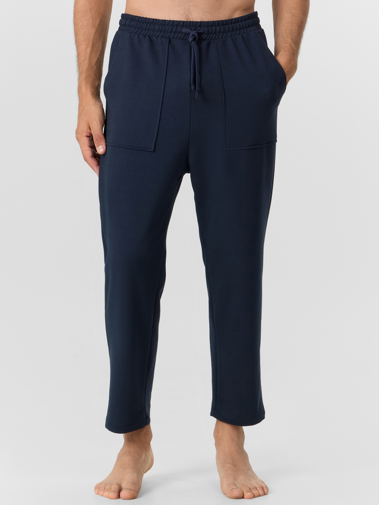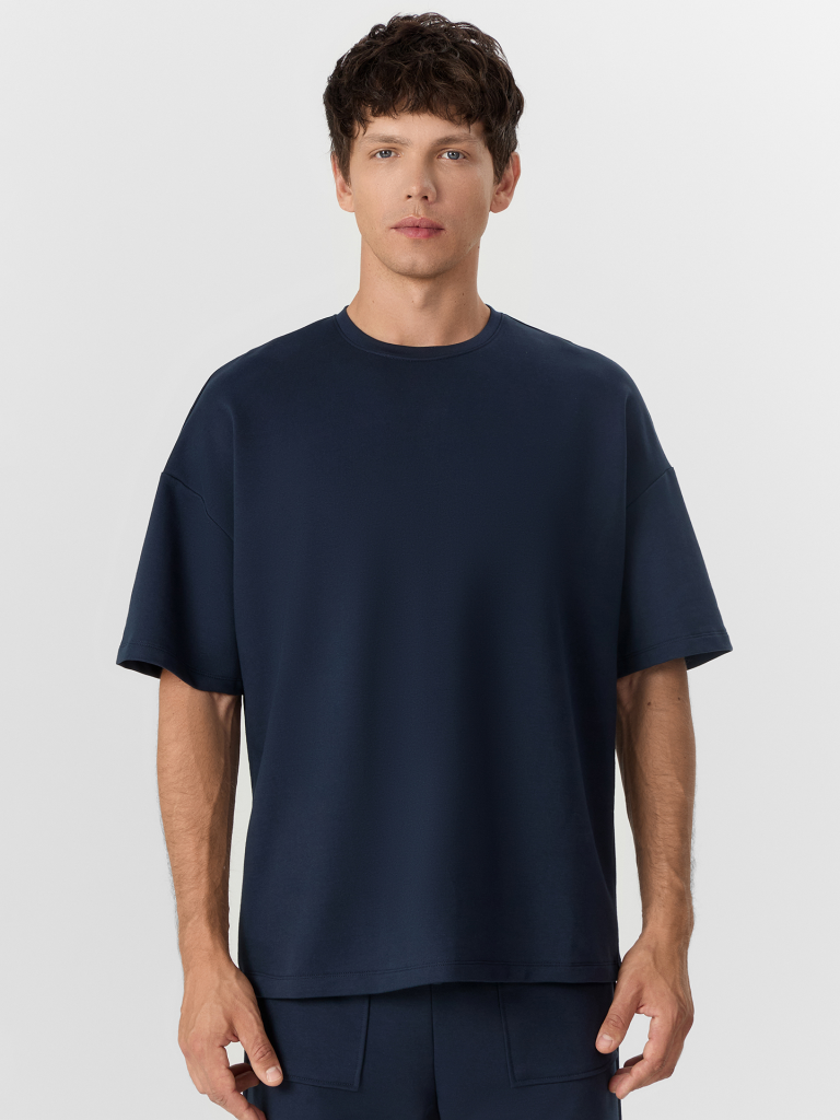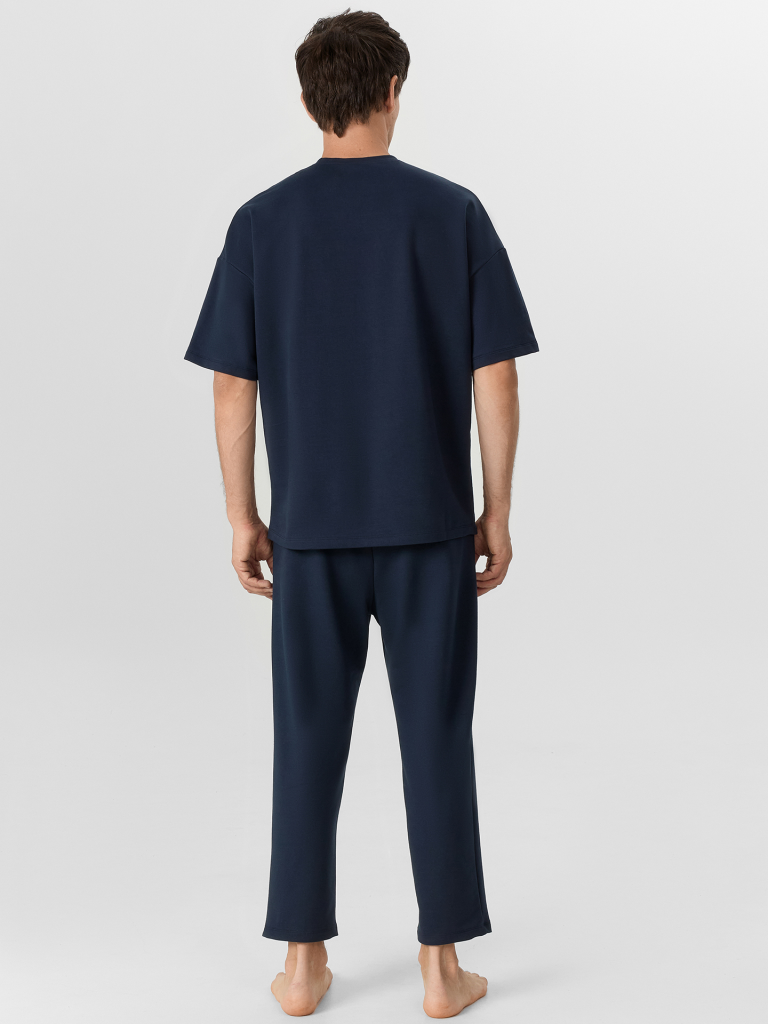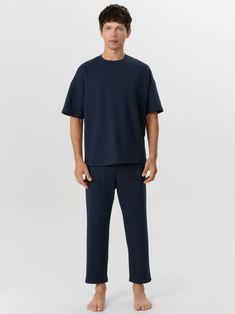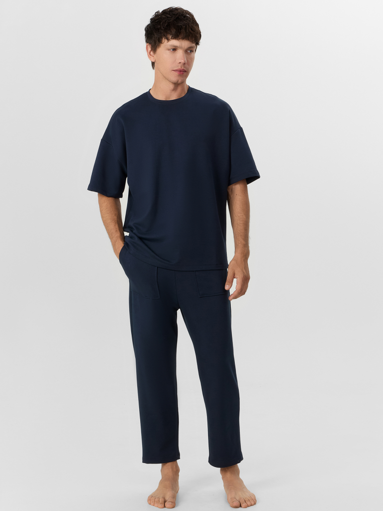 Мужской домашний комплект из трикотажного футера — это удобное и практичное решение для повседневного отдыха. Свободная футболка прямого кроя с округлой горловиной и короткими рукавами со спущенной линией плеча обеспечивает комфортную посадку и не сковывает движений. Аккуратная обработка низа и рукавов швом вподгибку подчеркивает качество исполнения и сохраняет форму изделия после стирок. Укороченные брюки прямого силуэта дополнены эластичной тесьмой в поясе, которая мягко фиксирует изделие на талии. Для дополнительного удобства предусмотрены петли и шнур, позволяющие регулировать посадку. Боковые карманы делают модель функциональной, а обработка низа швом в подгибку придает аккуратный и завершенный вид. Футер — это плотное, но мягкое трикотажное полотно, которое хорошо сохраняет тепло, пропускает воздух и приятно ощущается на теле. Такой комплект подойдет для сна, отдыха дома или неспешных утренних дел.